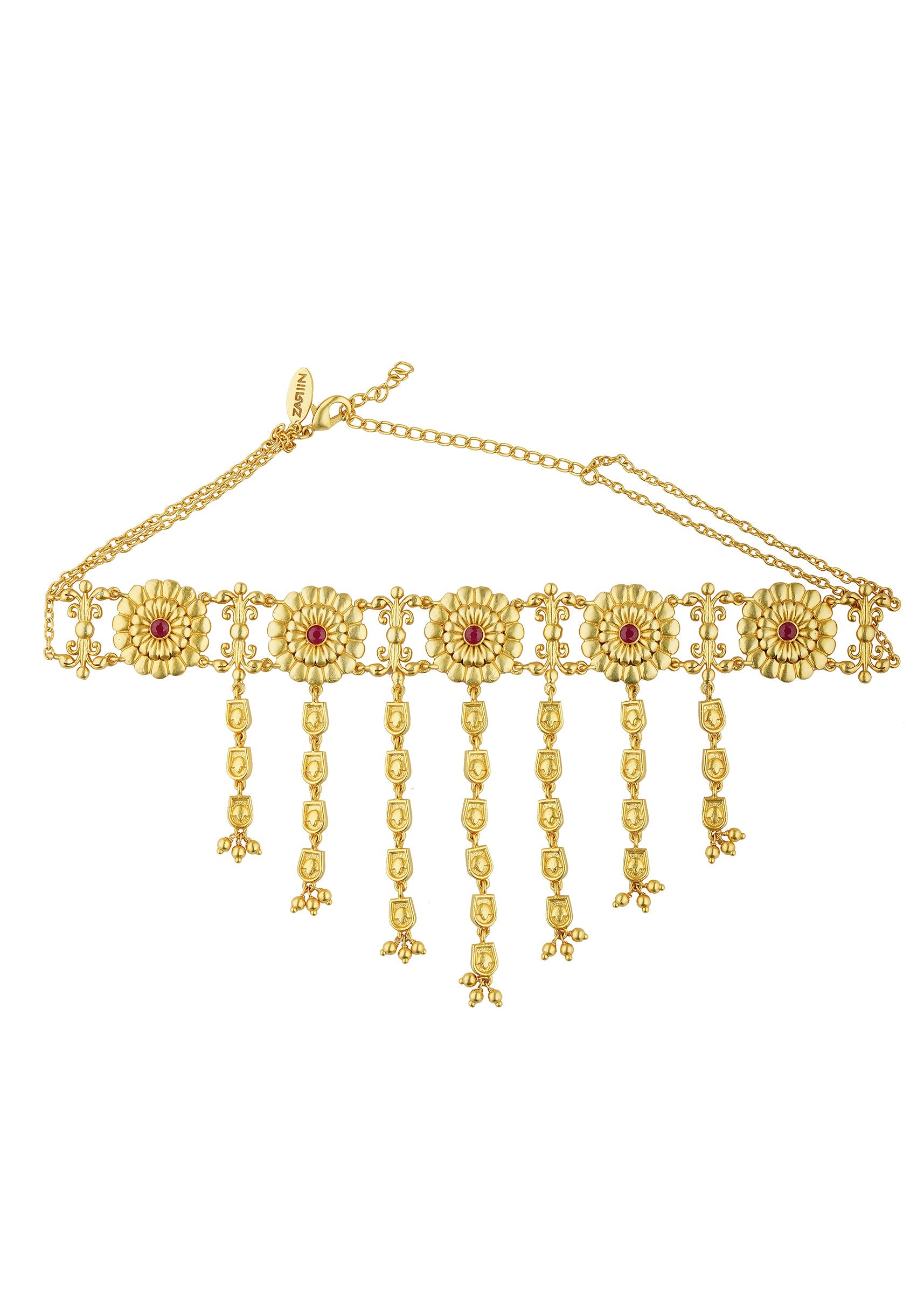 This Antique Gold Choker Necklace Is Crafted In Mix Metal Featuring Floral Motifs Accented With Shimmering Zircon Stones. The Cascading Chain Details Add A Touch Of Elegance Making It A Timeless Piece For Festive Occasions.Awarded As The Most Trusted Brand We'Re Delivering Styles You Love Just As Promised.