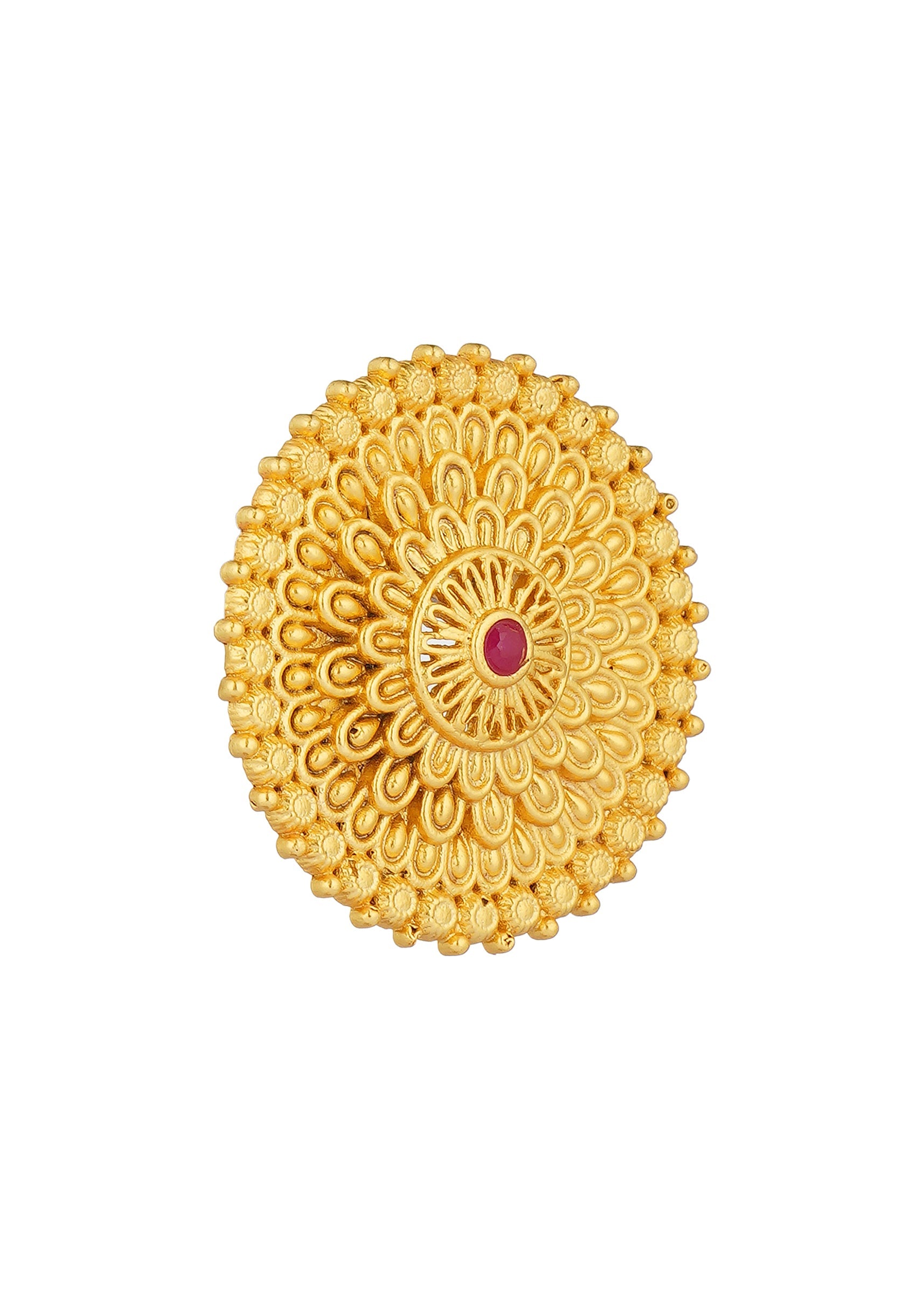 These Antique Gold Stud Earrings Showcase A Floral Motif Adorned With A Central Red Zircon And A Delicate Fringe Of Metallic Beads. Designed From Mix Metal The Intricate Detailing Adds A Timeless Elegance. Perfect For Festive Occasions They Blend Seamlessly With Both Traditional And Contemporary Outfits.Awarded As The Most Trusted Brand We'Re Delivering Styles You Love Just As Promised.