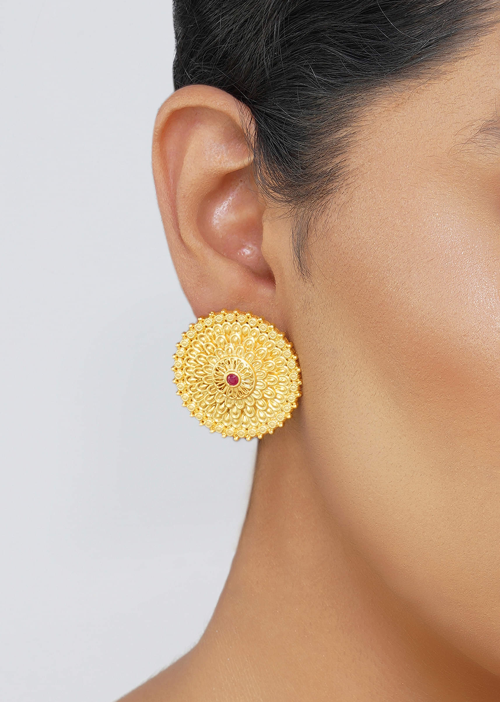These Antique Gold Stud Earrings Showcase A Floral Motif Adorned With A Central Red Zircon And A Delicate Fringe Of Metallic Beads. Designed From Mix Metal The Intricate Detailing Adds... More Product Details
