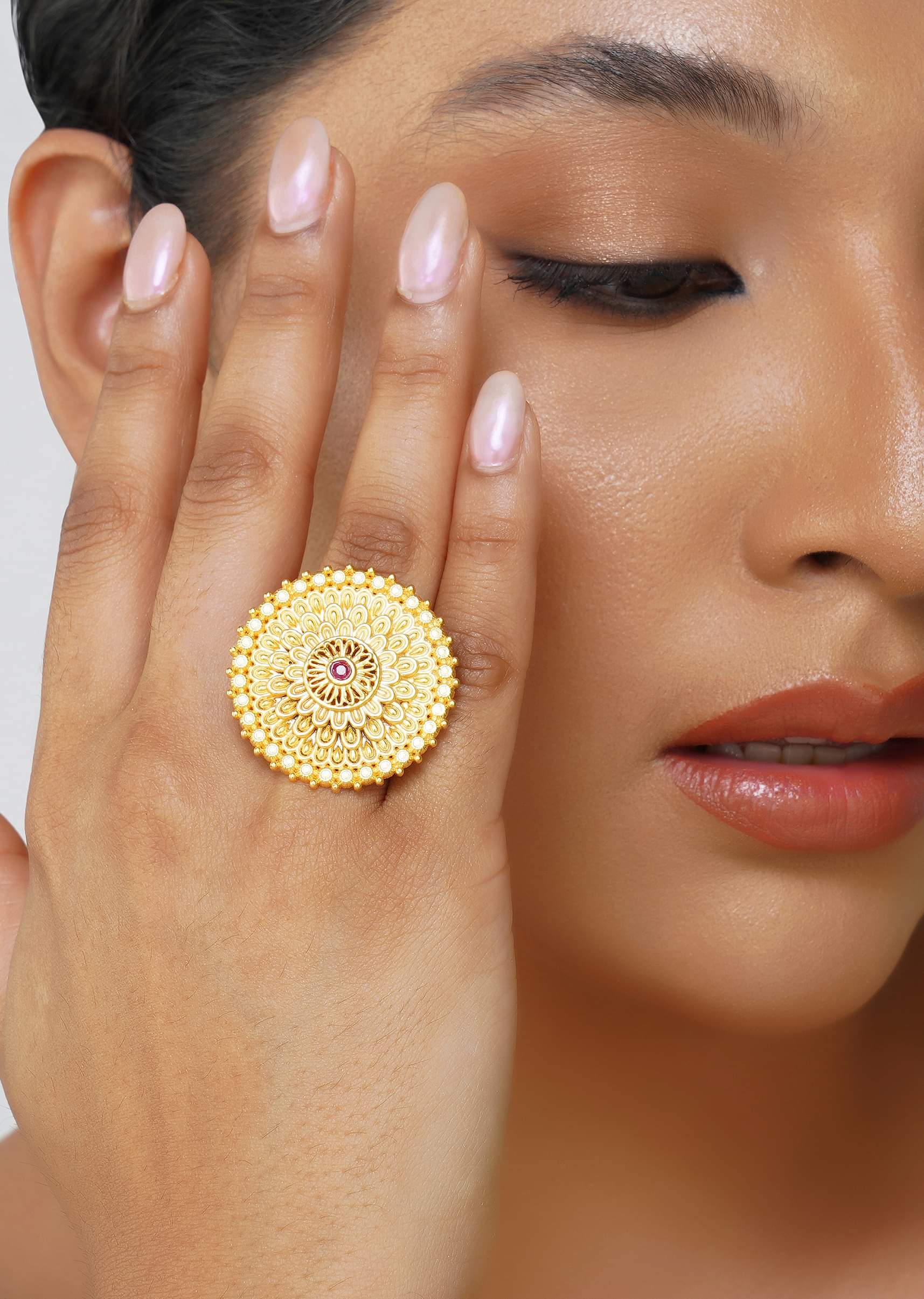 This Antique Gold Ring Captures Timeless Elegance With Its Intricate Floral Design Detailed With Zircon Embellishments For A Refined Touch. The Round Petal Motif Radiates Charm Making It A Perfect Accessory For Pooja And Other Traditional Gatherings. Crafted From Mixmetal It Ensures Durability And Comfort Without Compromising On Style.Awarded As The Most Trusted Brand We'Re Delivering Styles You Love Just As Promised.