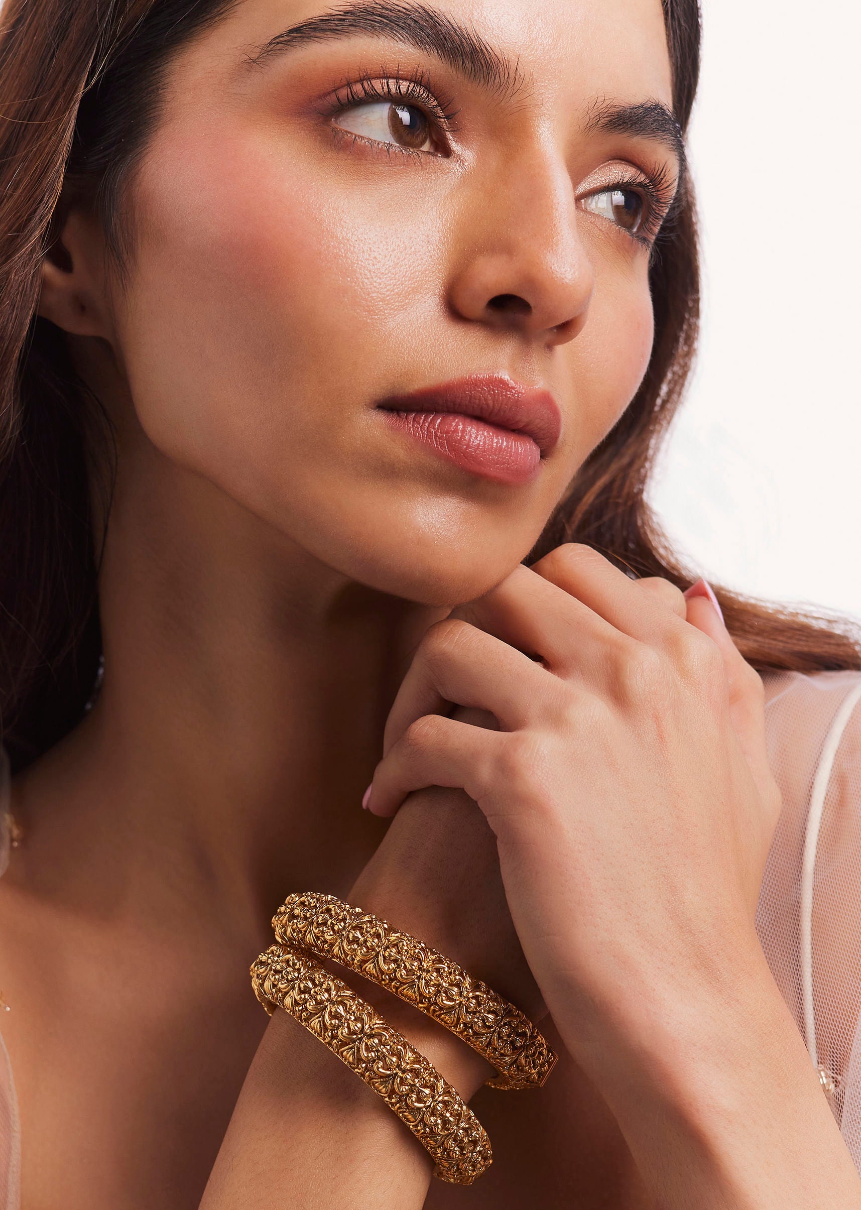 Antique gold-plated bangles with intricate detailing offer a vintage appeal. These bangles are the perfect accessory for adding an antique touch to your festive or wedding attire.Avoid contact with water, chemicals, harsh liquids, perfumes, etc.Hard contact must be avoided completely.Slight variations in design may vary. Awarded as the Most Trusted Brand, we're delivering styles you love, just as promised.