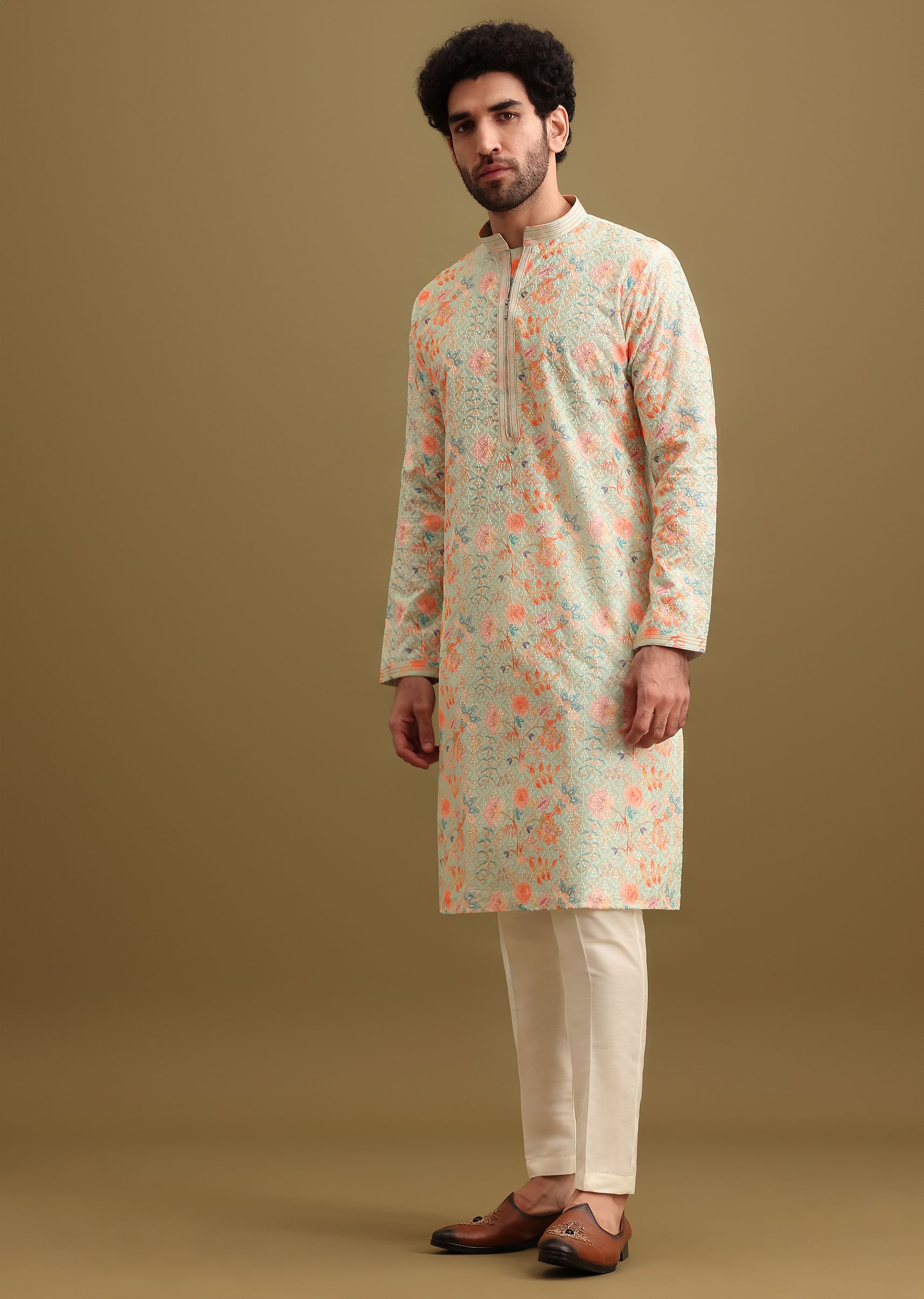 Dive into elegance with our aqua blue kurta set. Adorned with mesmerizing digital prints and intricate schiffli work detailing, this ensemble exudes a perfect blend of tradition and modernity. The luxurious silk fabric offers a regal touch, making it ideal for festive celebrations. The kurta is paired with pants. Button design, shape, and size may vary as per availability. Awarded as the Most Trusted Brand, we're delivering styles you love, just as promised.