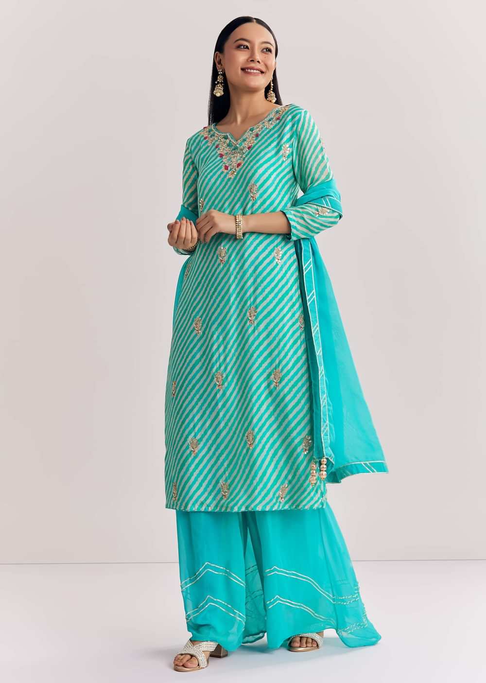 Romantic and refined, this aqua blue leheriya georgette kurta palazzo suit features gotta work and comes with a statement organza dupatta edged in traditional gotta lace. Awarded as the Most... More Product Details