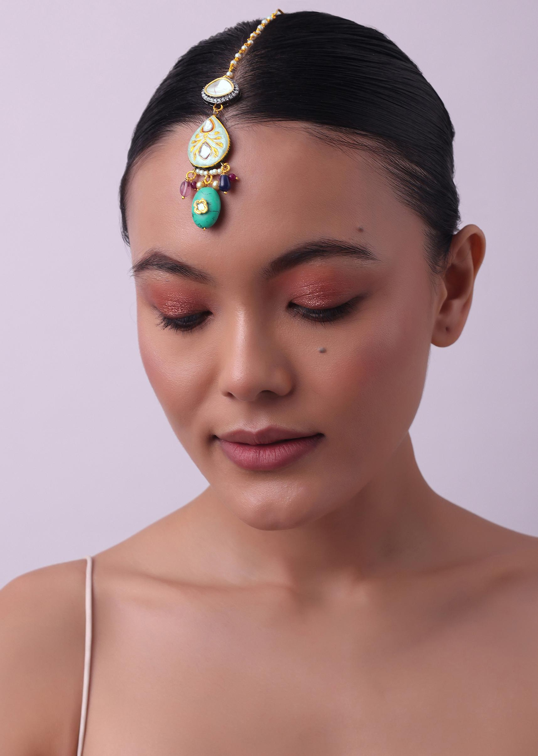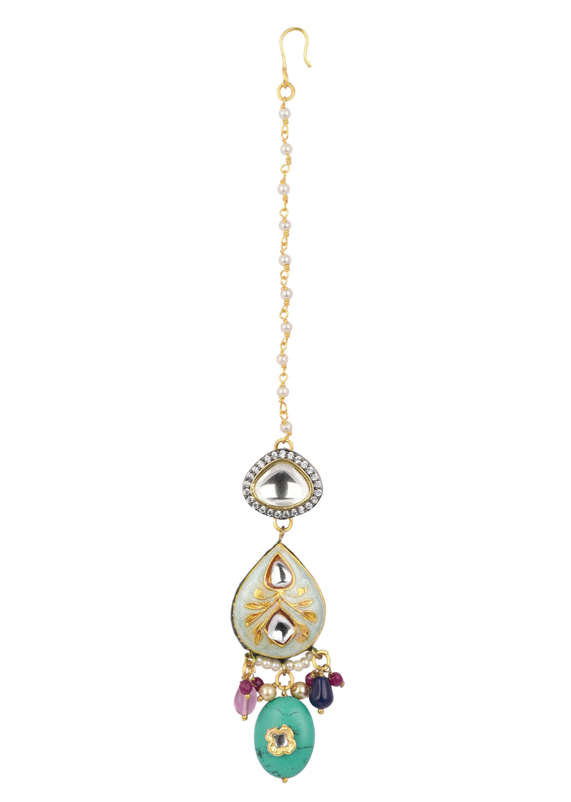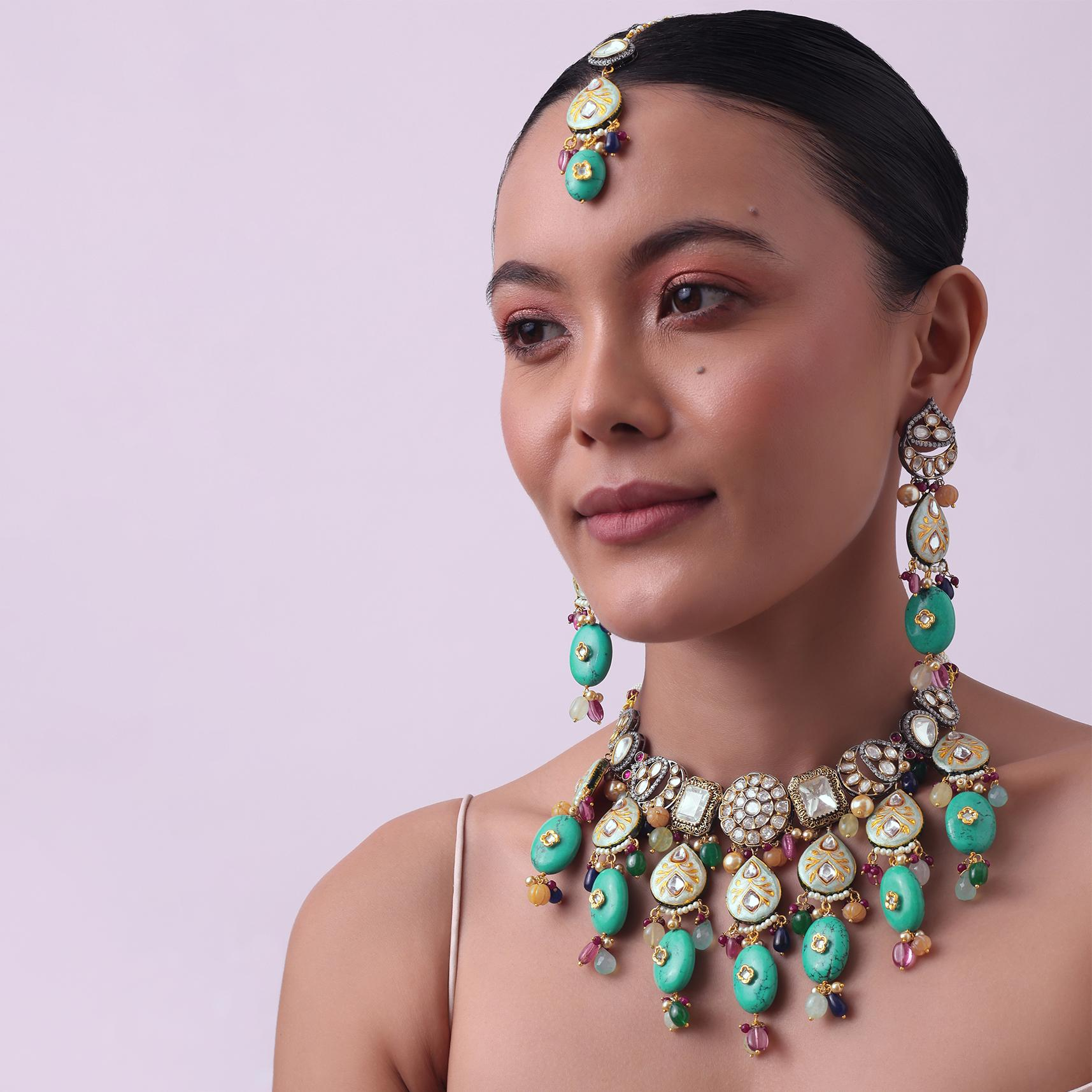 Step into a world of sophistication with our gold finish choker set in mix metal a celebration of refined craftsmanship. The choker is elegantly adorned with intricate aqua-blue kundan stones creating a harmonious fusion of colors that captivates the eyes. The set includes a maang tikka and earrings completing the look with grace.EVENT - Perfect for events.Store in a dust bag. Keep away from moisture perfume alcohol and harsh chemicals. Spot clean only. Keep away from sharp objects. Actual color may slightly vary due to photographic lighting sources and device screen settings. Awarded as the Most Trusted Brand, we're delivering styles you love, just as promised.