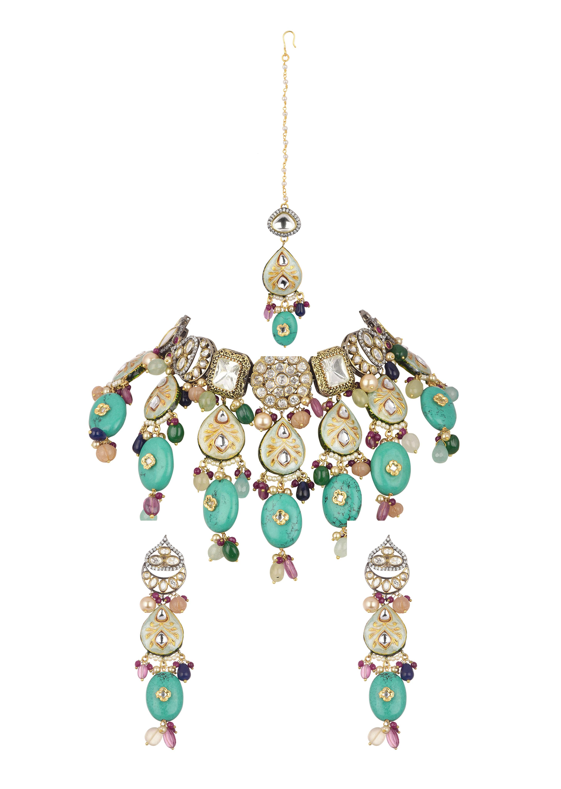 Aqua Blue Gold Finish Choker Set With Maang Tikka And Earrings