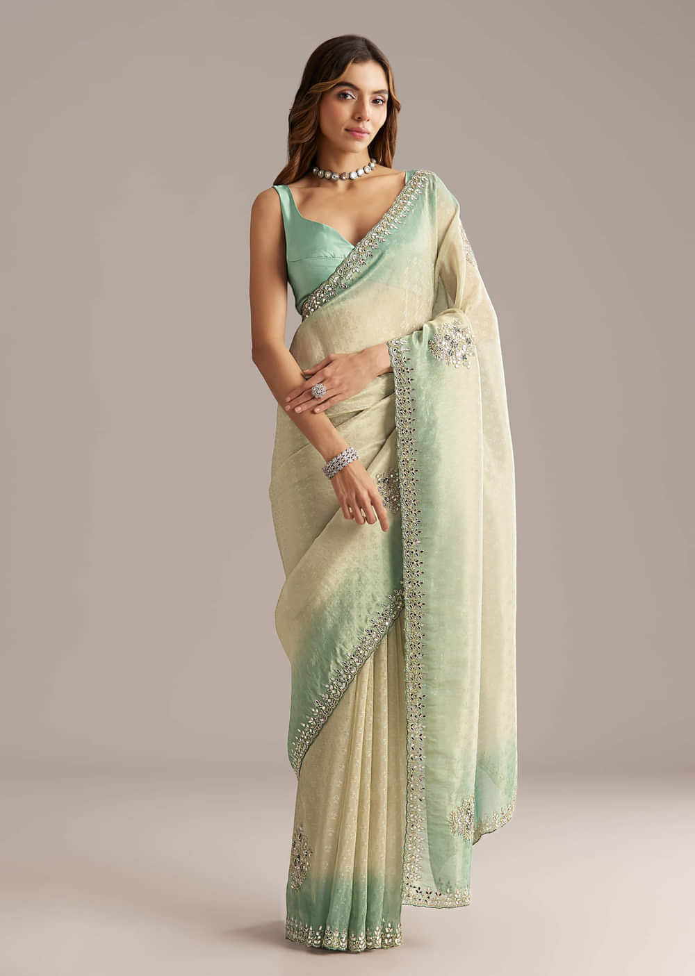 Aqua Blue Jacquard Saree With Mirror And Bead Embroidery