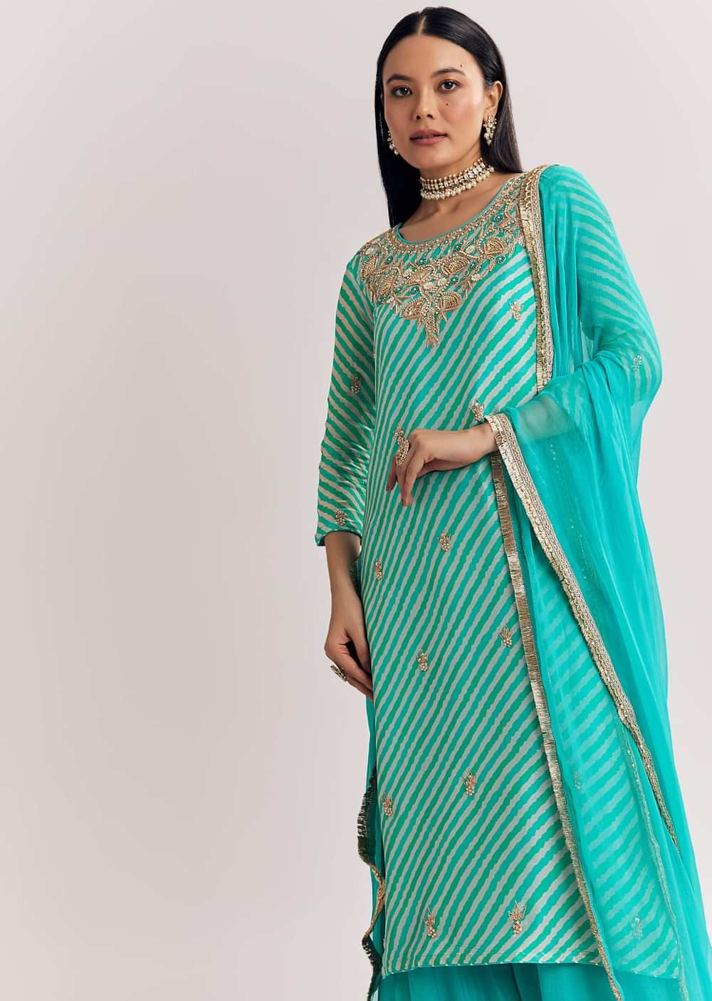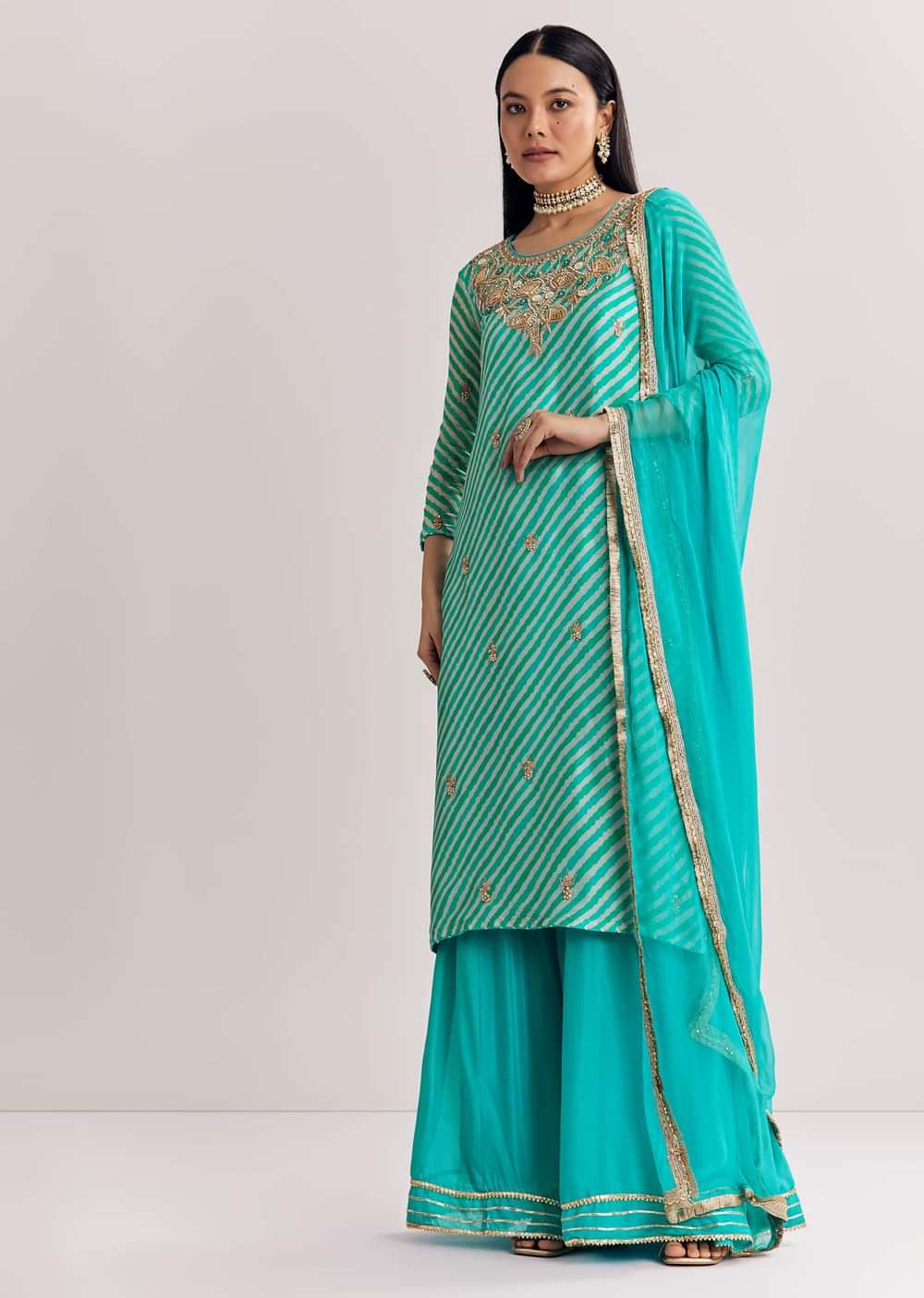 Aqua Blue Leheriya Kurta Palazzo Suit With Zardosi And Moti Work