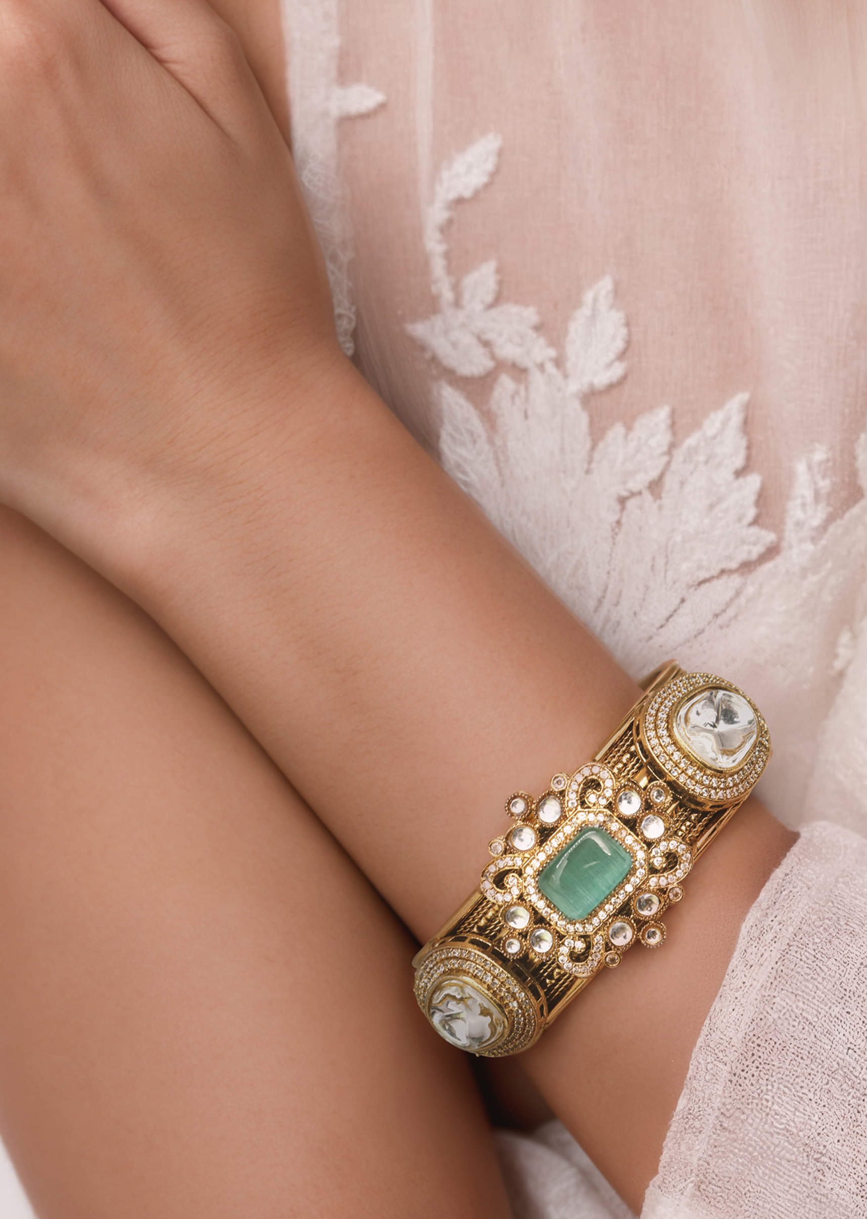 An aqua blue modern polki-encrusted bangle featuring sparkling stones and contemporary design, adding a vibrant, elegant touch. Perfect for enhancing bridal, festive, or ethnic ensembles with a pop of color. Awarded as the Most Trusted Brand, we're delivering styles you love, just as promised.