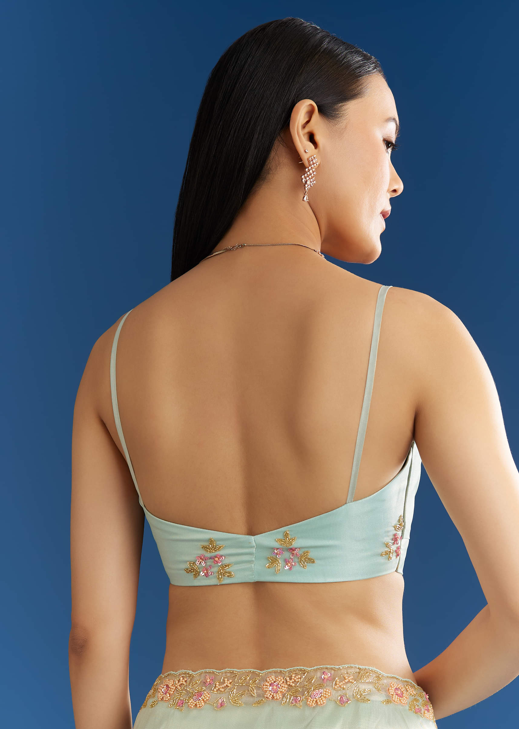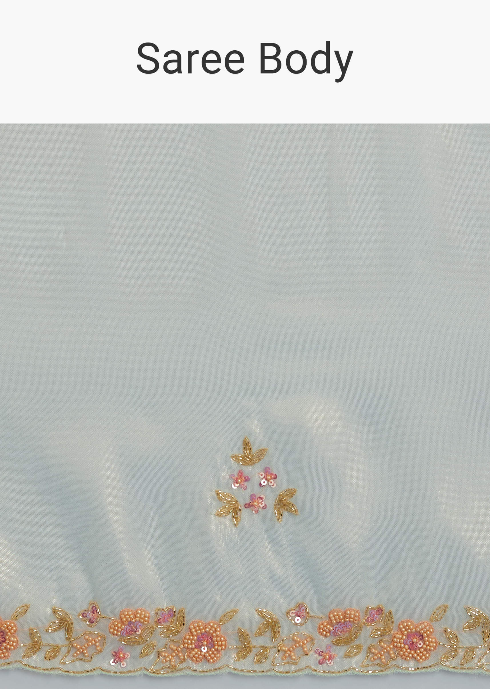 This aqua blue saree stands out with multicolored beads and cutdana work across its scalloped border, glowing like ocean sunlight. Awarded as the Most Trusted Brand, we're delivering styles you love, just as promised.
