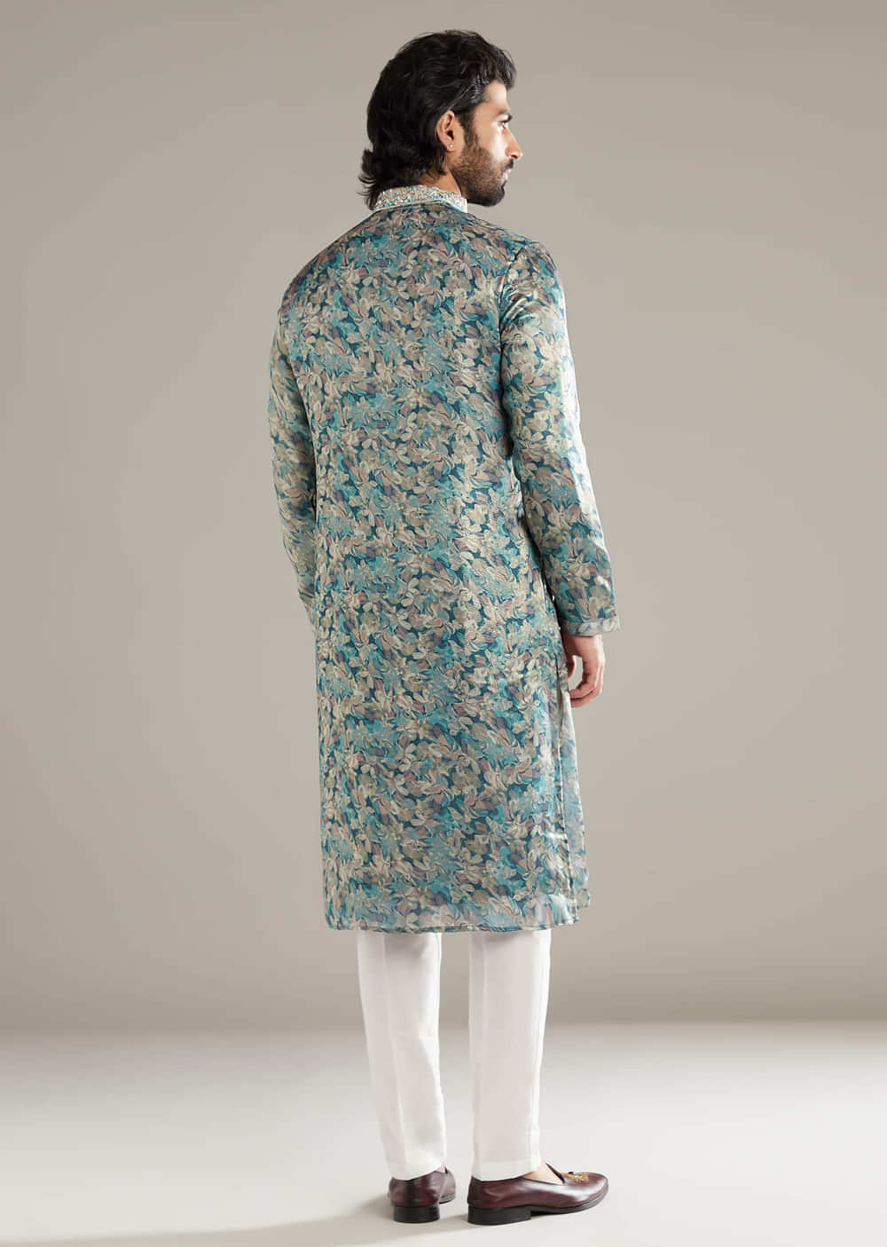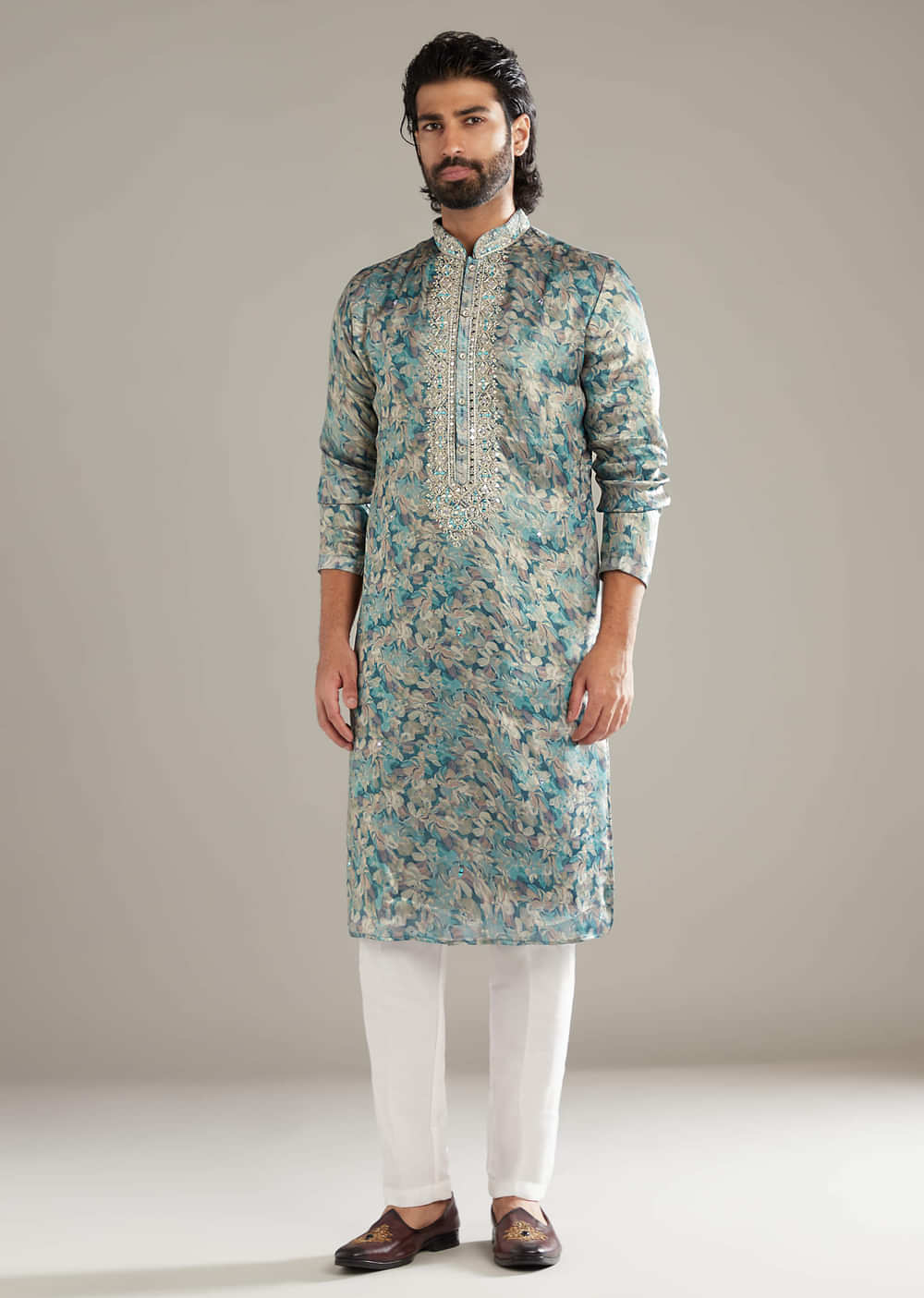 Aqua Blue Silk Kurta Set For Men With Hand Embroidery And Floral Print