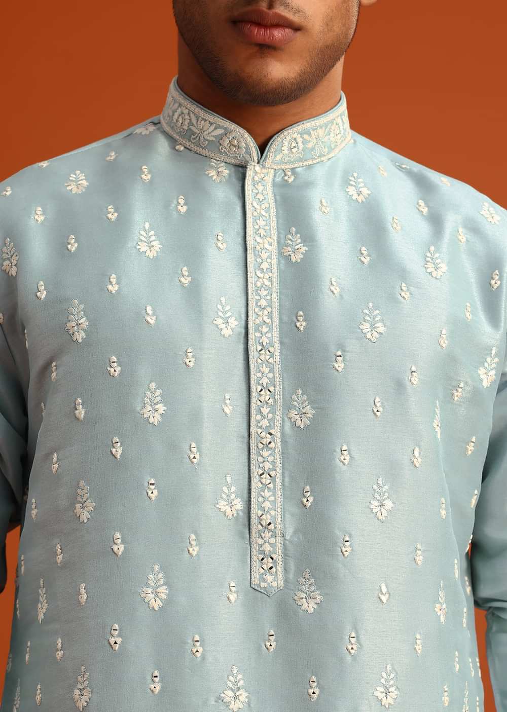 Add elegance and charm to your traditional wardrobe with this men's silk kurta and pant set that is set on a serene blue canvas. The kurta showcases intricate booti embroidery... More Product Details