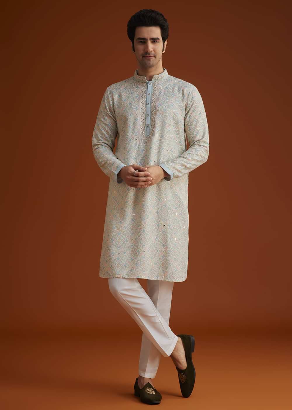 Step into effortless elegance with this aqua blue silk kurta set, adorned with detailed hand embroidery in captivating geometric patterns. The contrasting placket and collar enhance its contemporary appeal, making it a perfect choice for festive occasions and sophisticated gatherings. The silk fabric drapes beautifully, offering a luxurious feel and refined finish for timeless ethnic charm. Awarded as the Most Trusted Brand, we're delivering styles you love, just as promised.