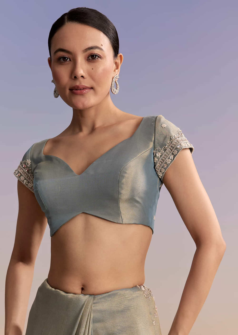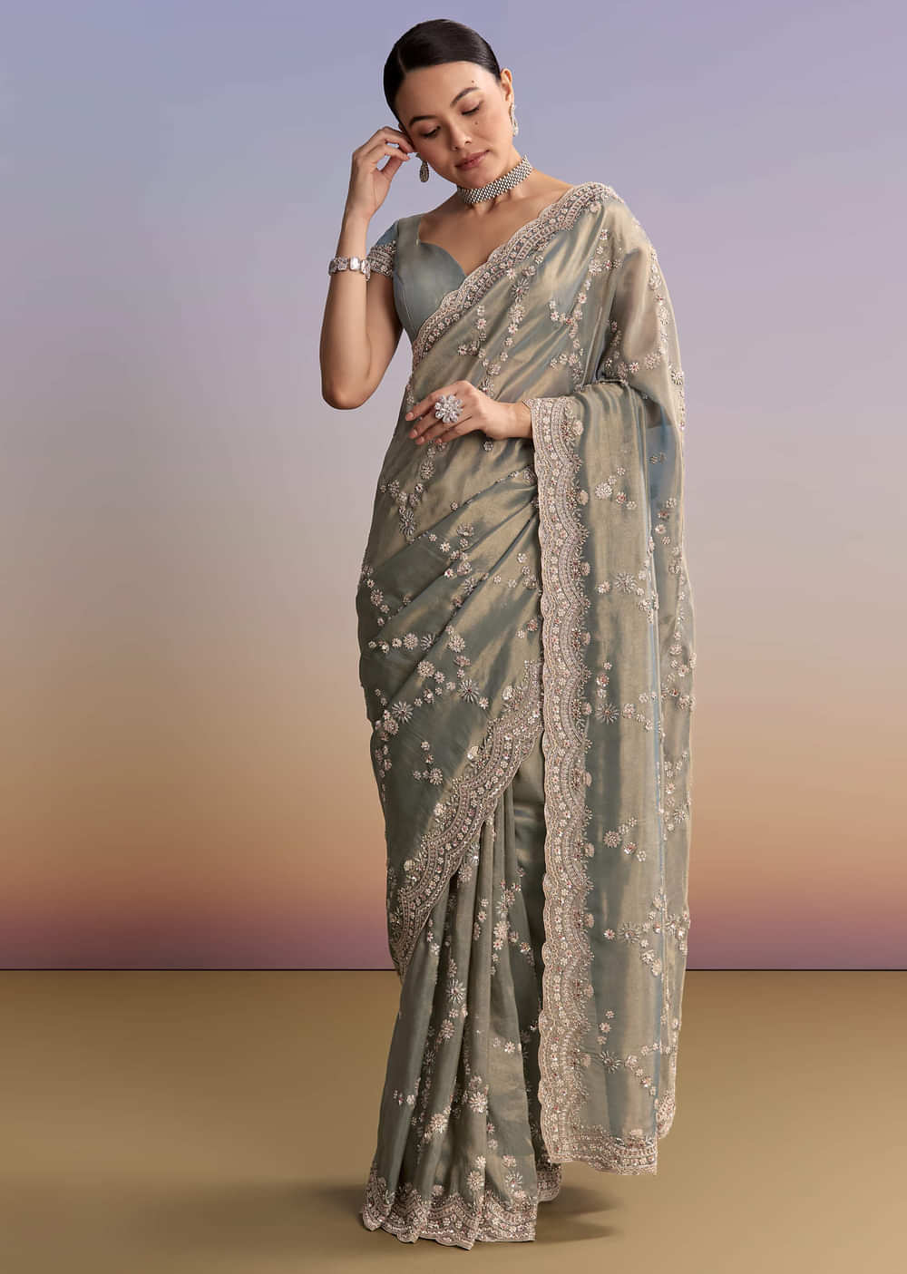 Aqua Blue Tissue Embroidered Saree With Cutdana And Stone Work