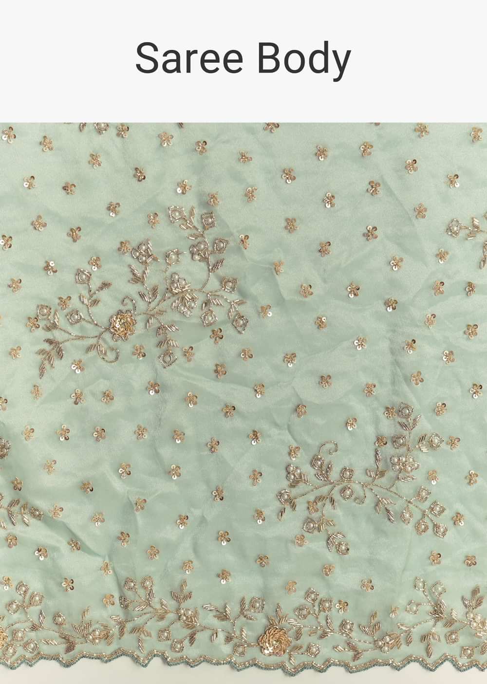 Best suited for sangeet, receptions, or cocktail evenings, this aqua blue saree in tissue fabric showcases sequin, cutdana, and bead embroidery. A cutwork border and embellished blouse add a sophisticated finish. Includes one unstitched blouse. Awarded as the Most Trusted Brand, we're delivering styles you love, just as promised.
