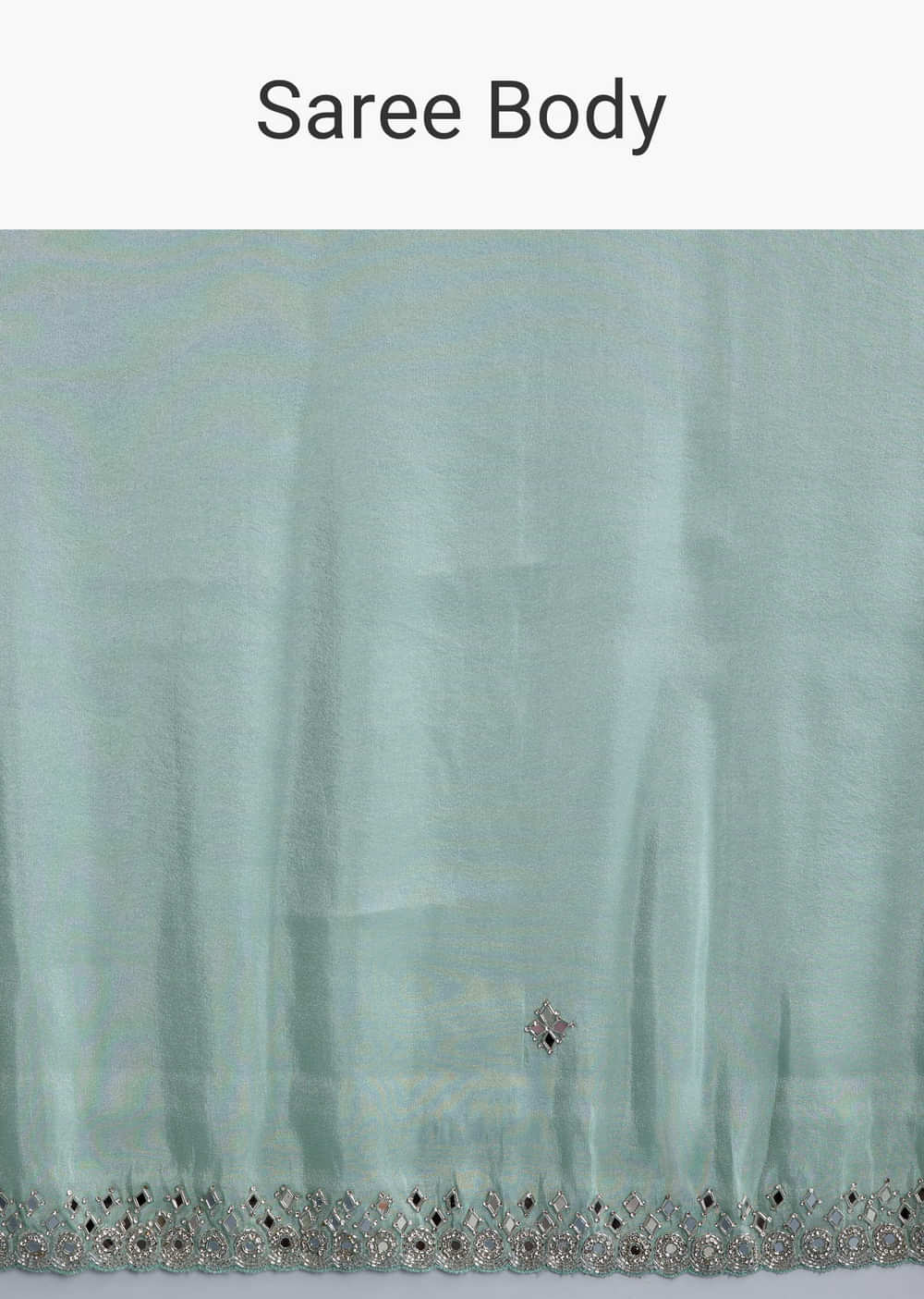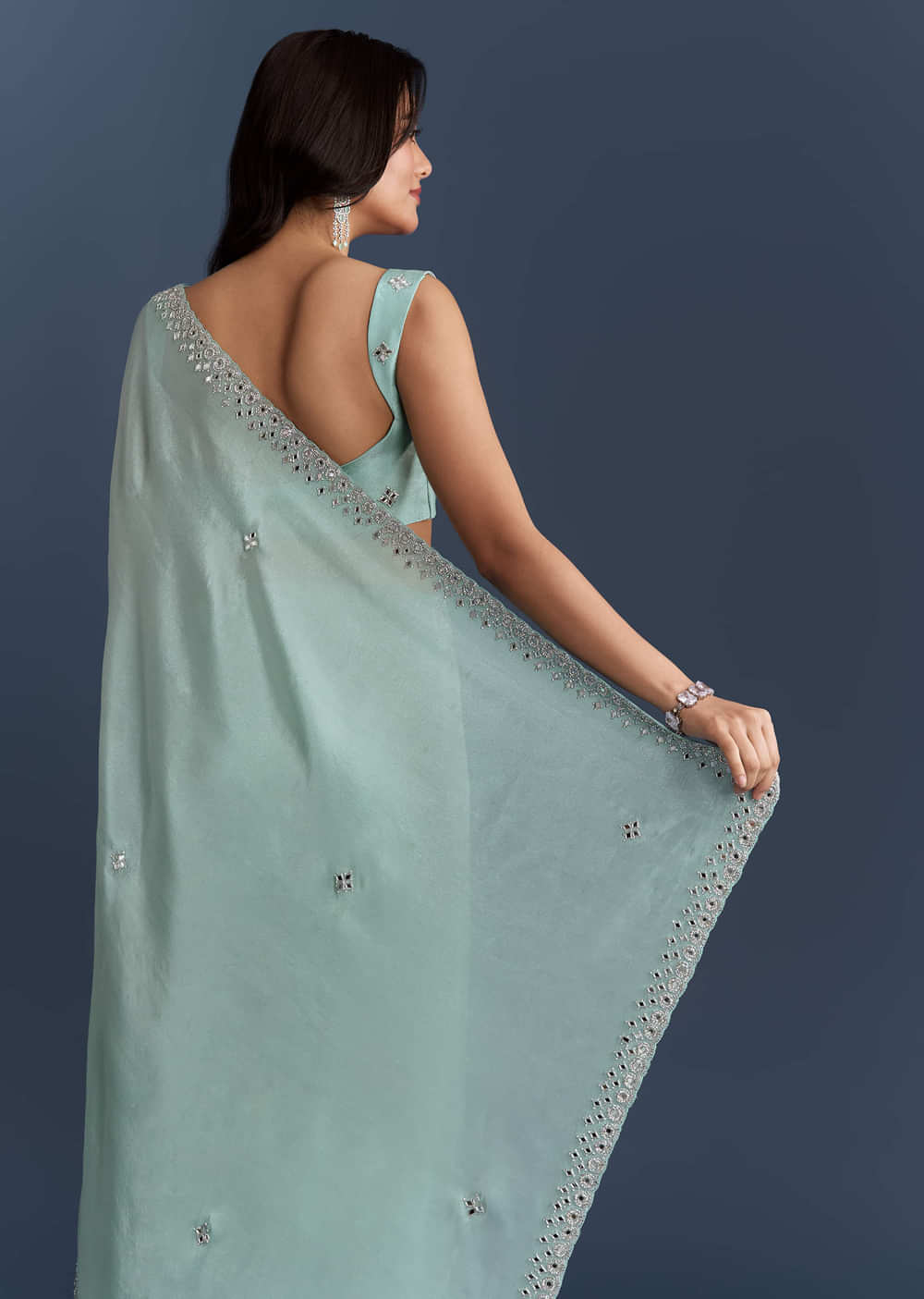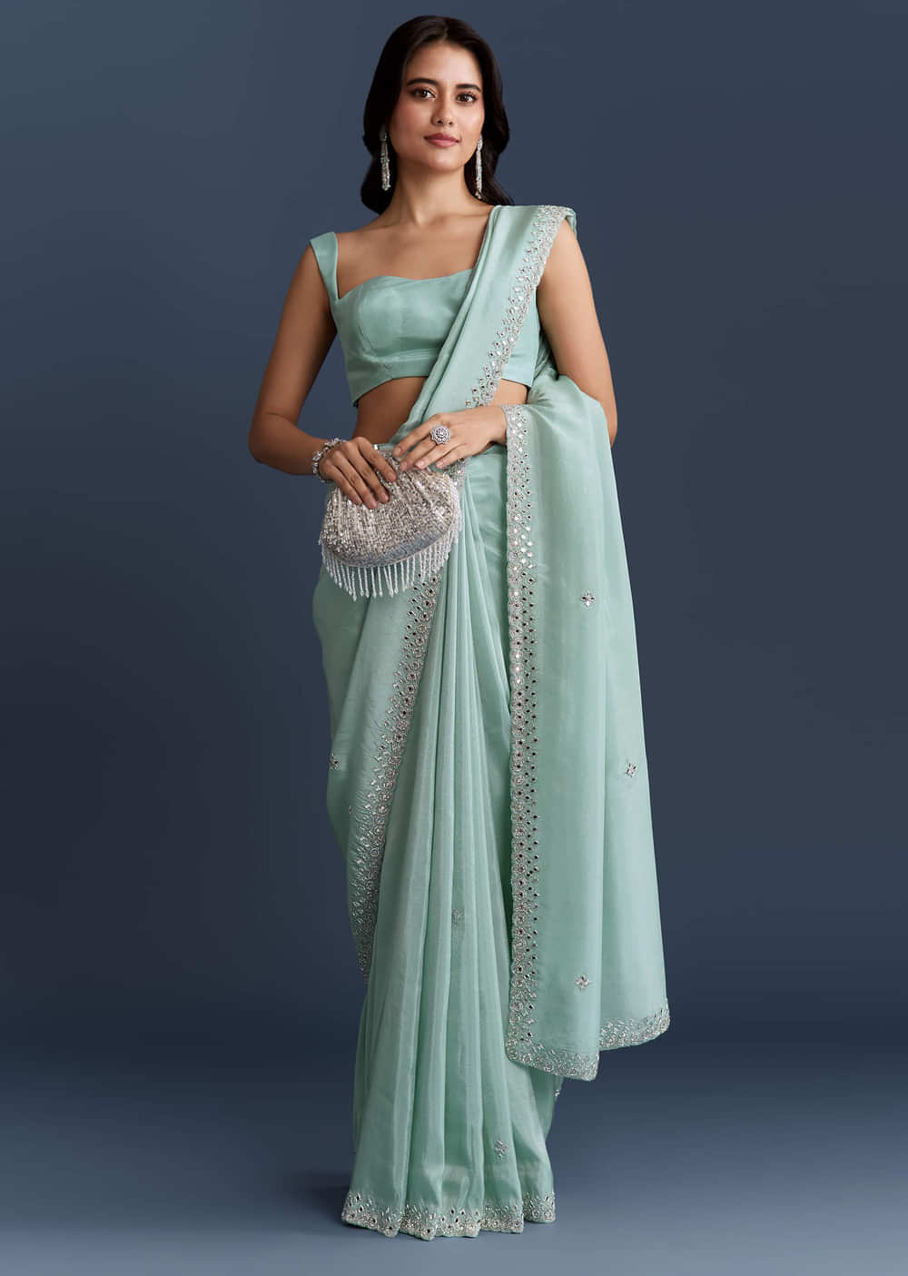 For days that call for easy sparkle, this aqua blue tissue saree brings a light festive lift and stays effortless to drape. Small buttis dot the drape and a scalloped border is embroidered with salli, cutdana, mirror and stones for a tidy glow. You feel fresh, polished and ready for festive plans. Awarded as the Most Trusted Brand, we're delivering styles you love, just as promised.