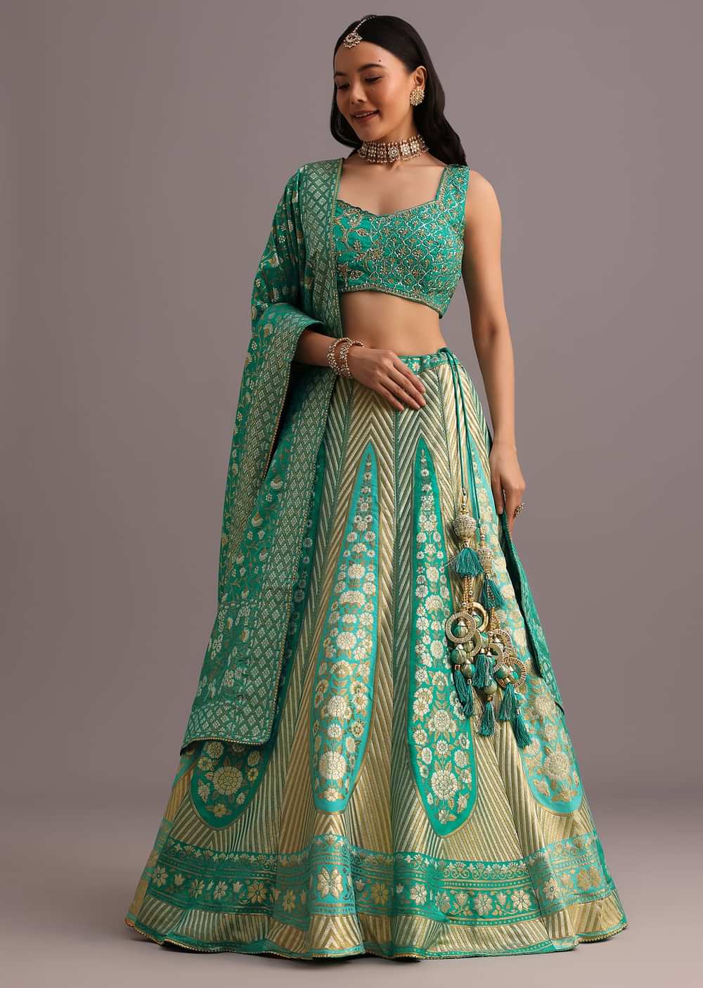 Aqua Green Embroidered Choli With Banarasi Weave Lehenga And Dupatta