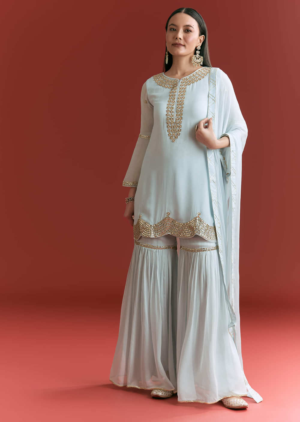 Baby Blue Georgette Kurta Sharara Suit With Gotta Lace And Moti Work