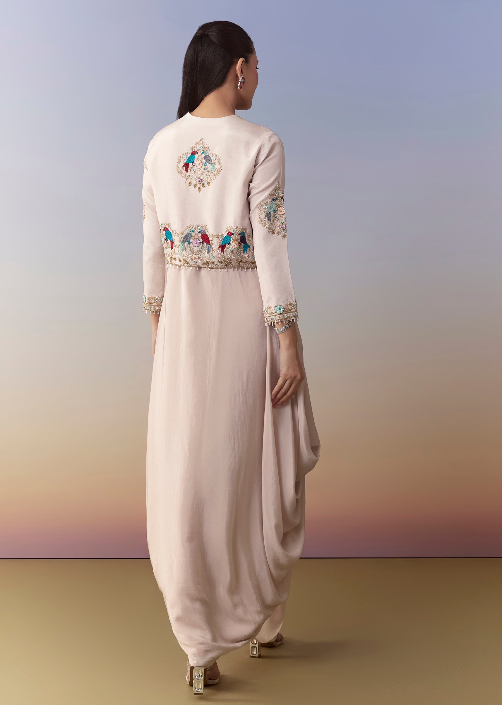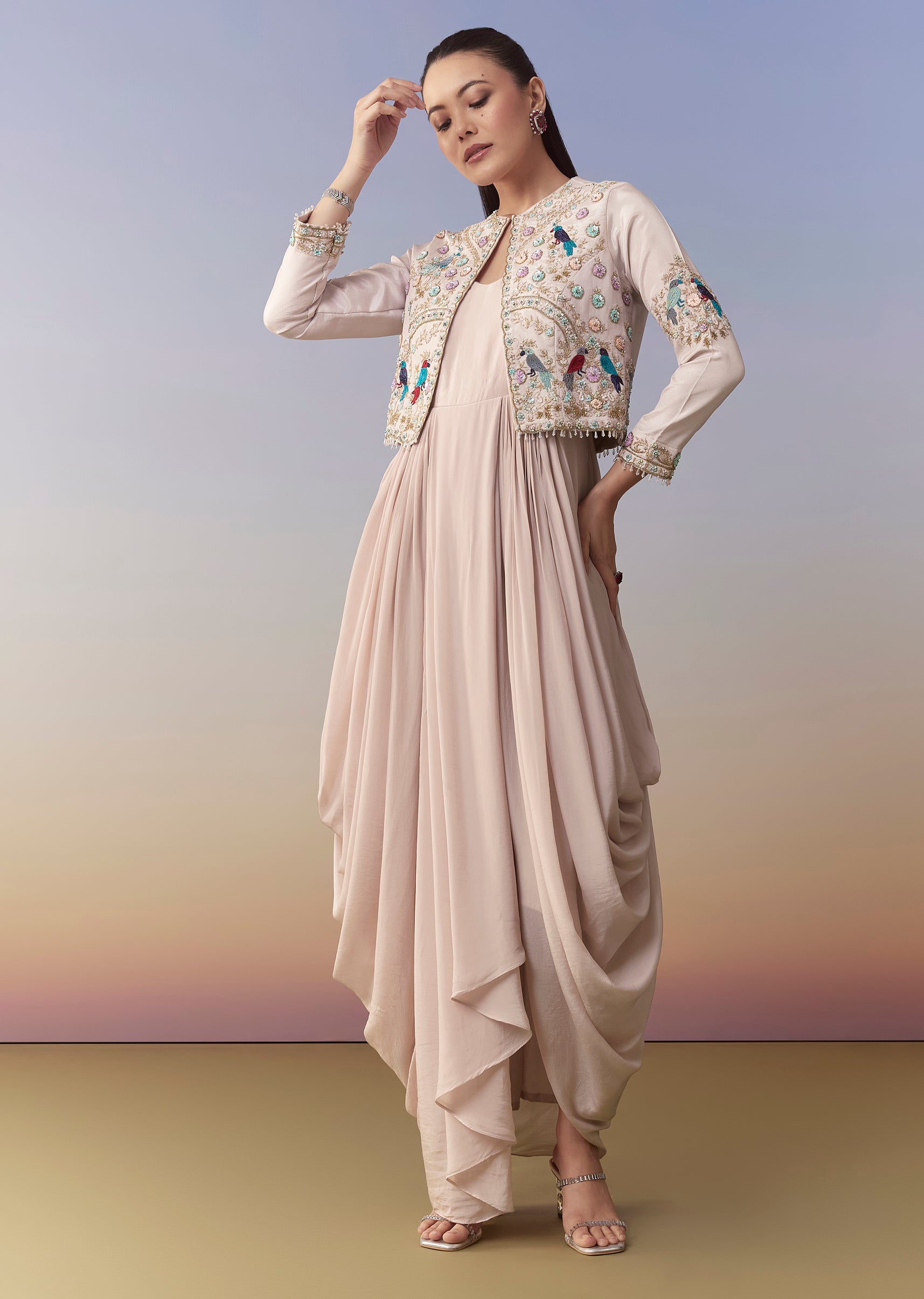 Baby Pink Cowl Draped Sequin Gown and Jacket Set
