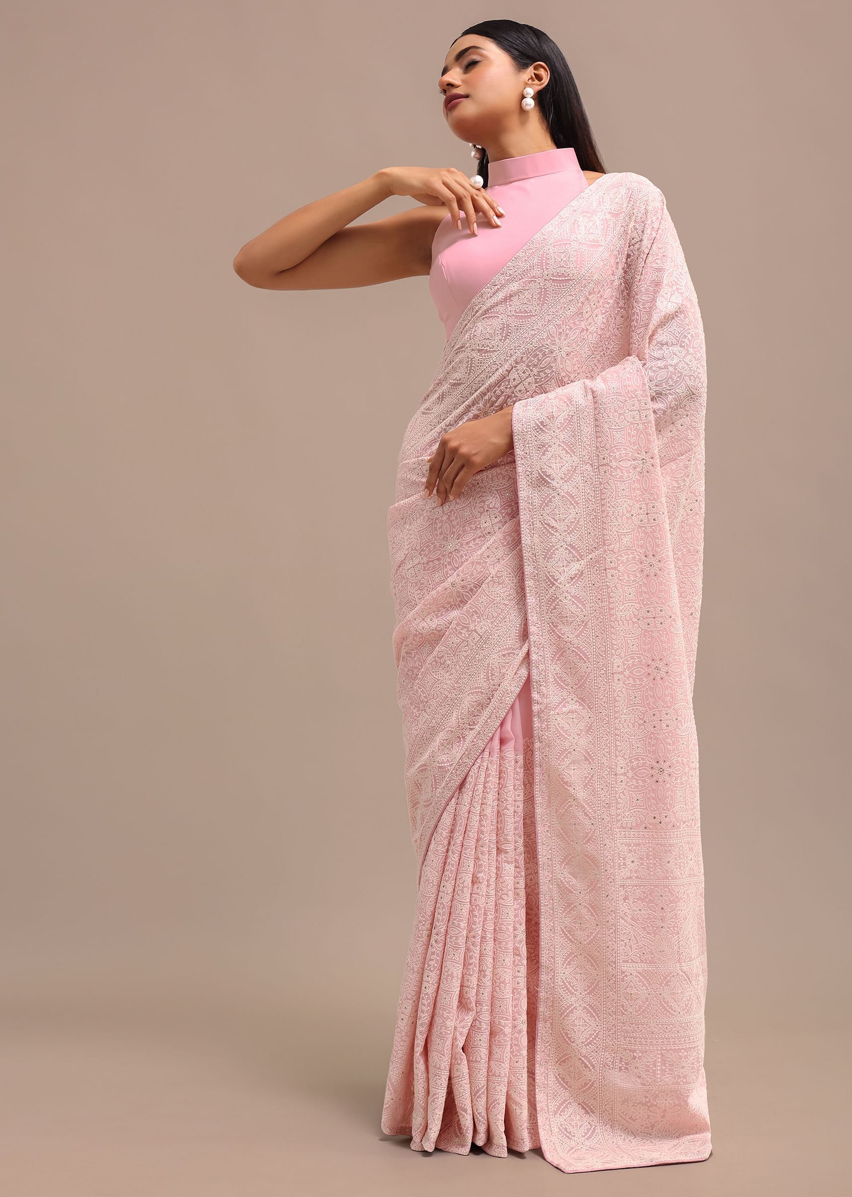 Baby Pink Georgette Chikankari Saree With Unstitched Blouse