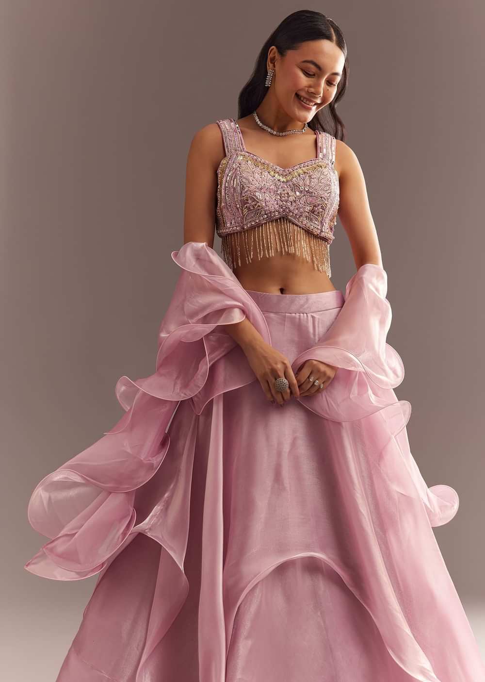 Baby Pink Organza Ruffled Lehenga Choli With Sequins