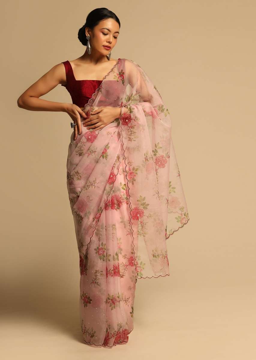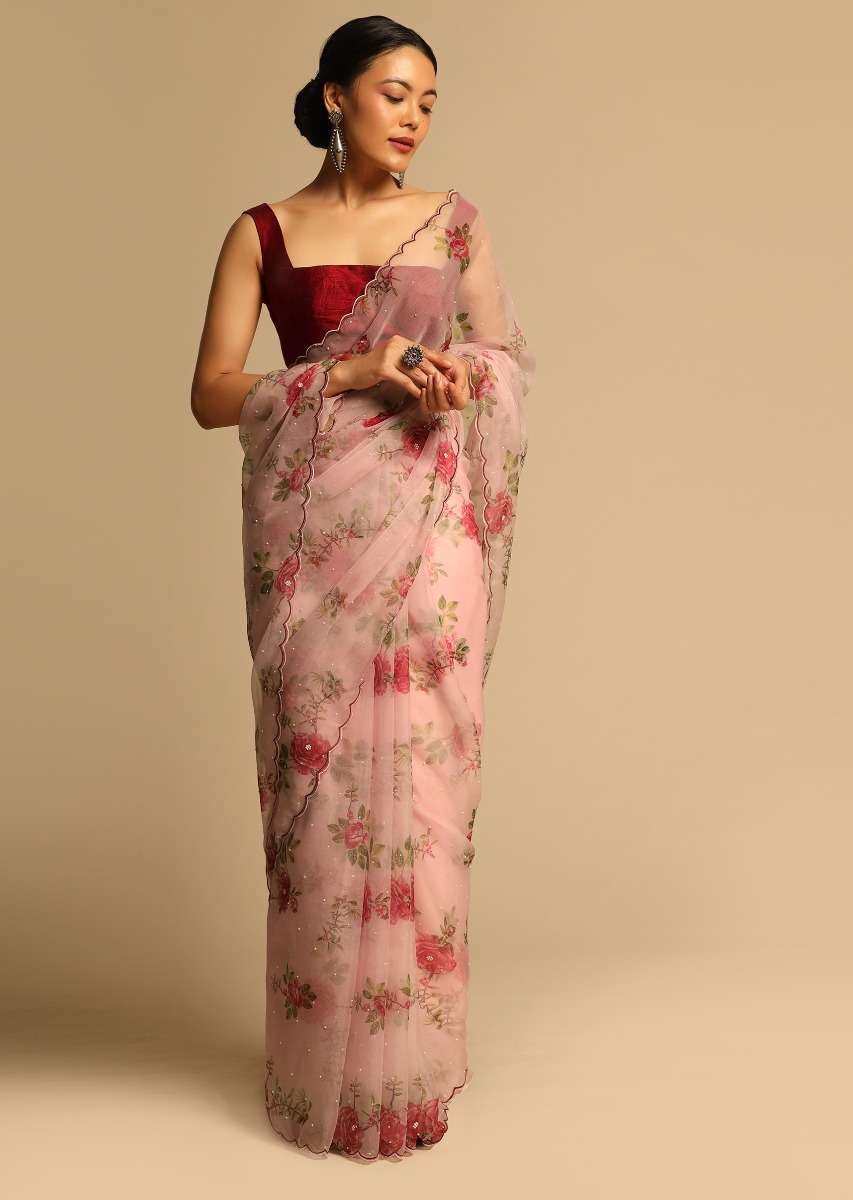 Baby pink saree in organza with floral print and scattered moti work.The border is adorned with resham work in scallop design.Note - The border color may vary.It is paired with a matching pink unstitched blouse in silk.Please note that the blouse worn by the model is for styling purpose only. . Awarded as the Most Trusted Brand, we're delivering styles you love, just as promised.