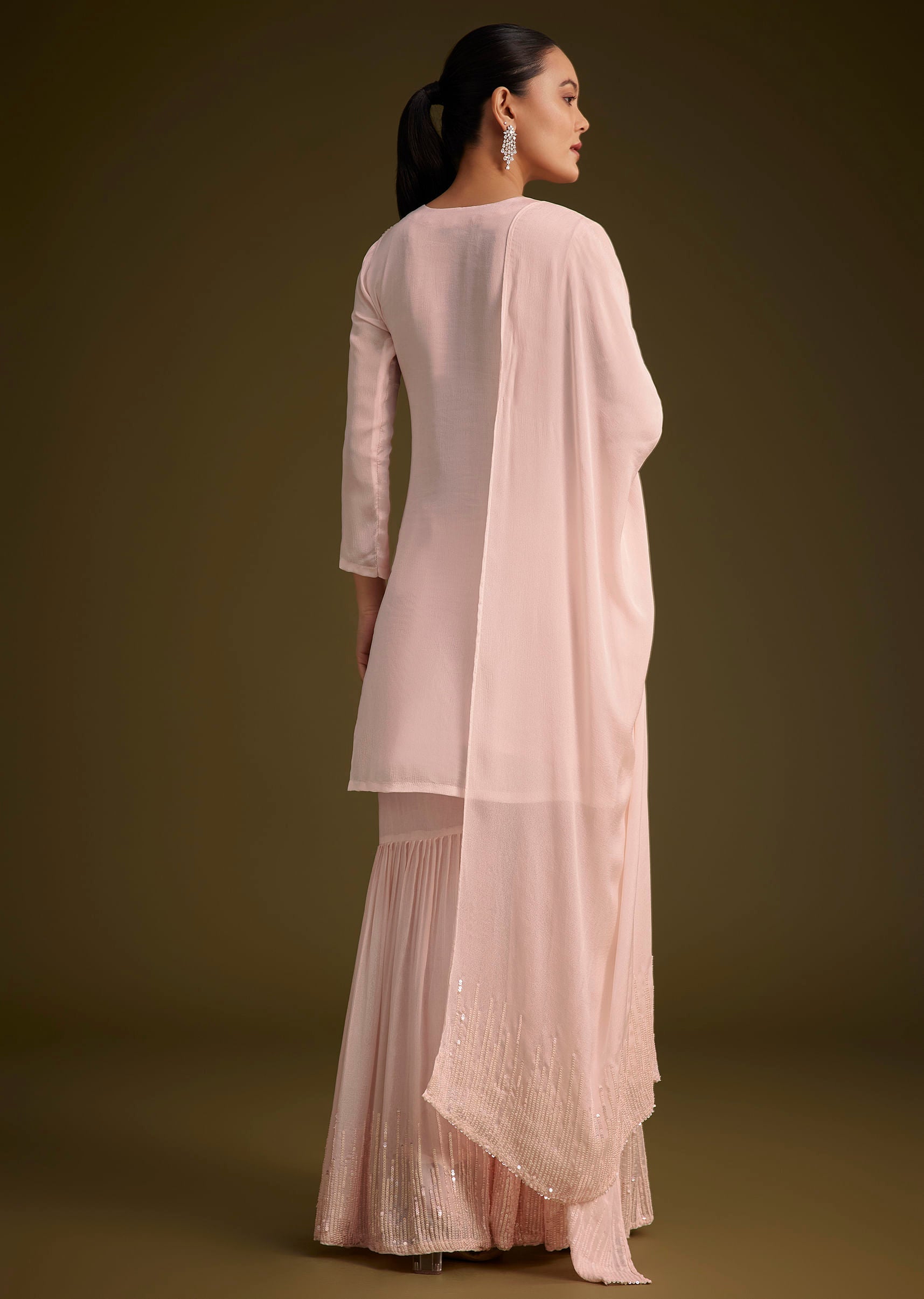 Embrace Effortless Elegance With This Baby Pink Chinon Kurta Set Paired With A Flowing Sharara And A Matching Dupatta. Highlighted With Shimmering Sequins This Set Is Perfect For Weddings Festive... More Product Details