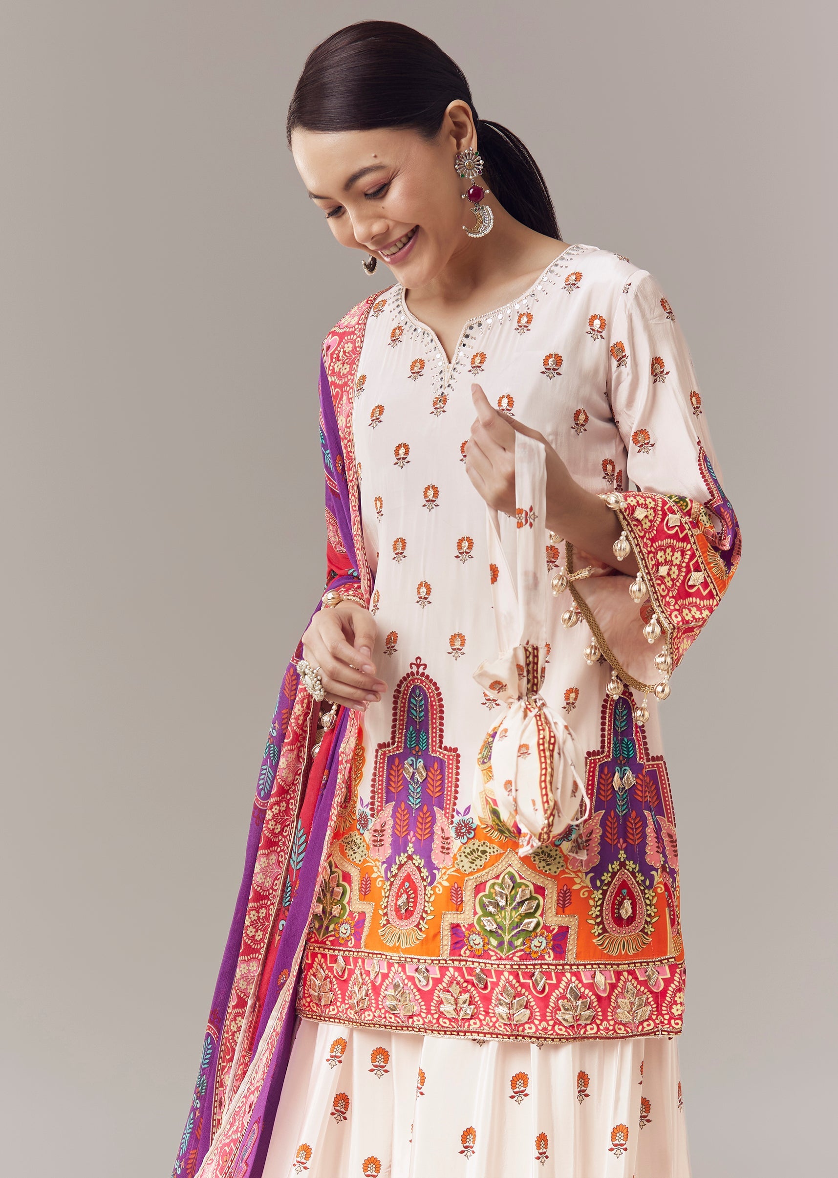 Delicate and festive, this baby pink sharara suit is perfect for Mehendi and wedding celebrations. Crafted in soft crepe fabric, the kurta features intricate indie prints enhanced with mirror and... More Product Details