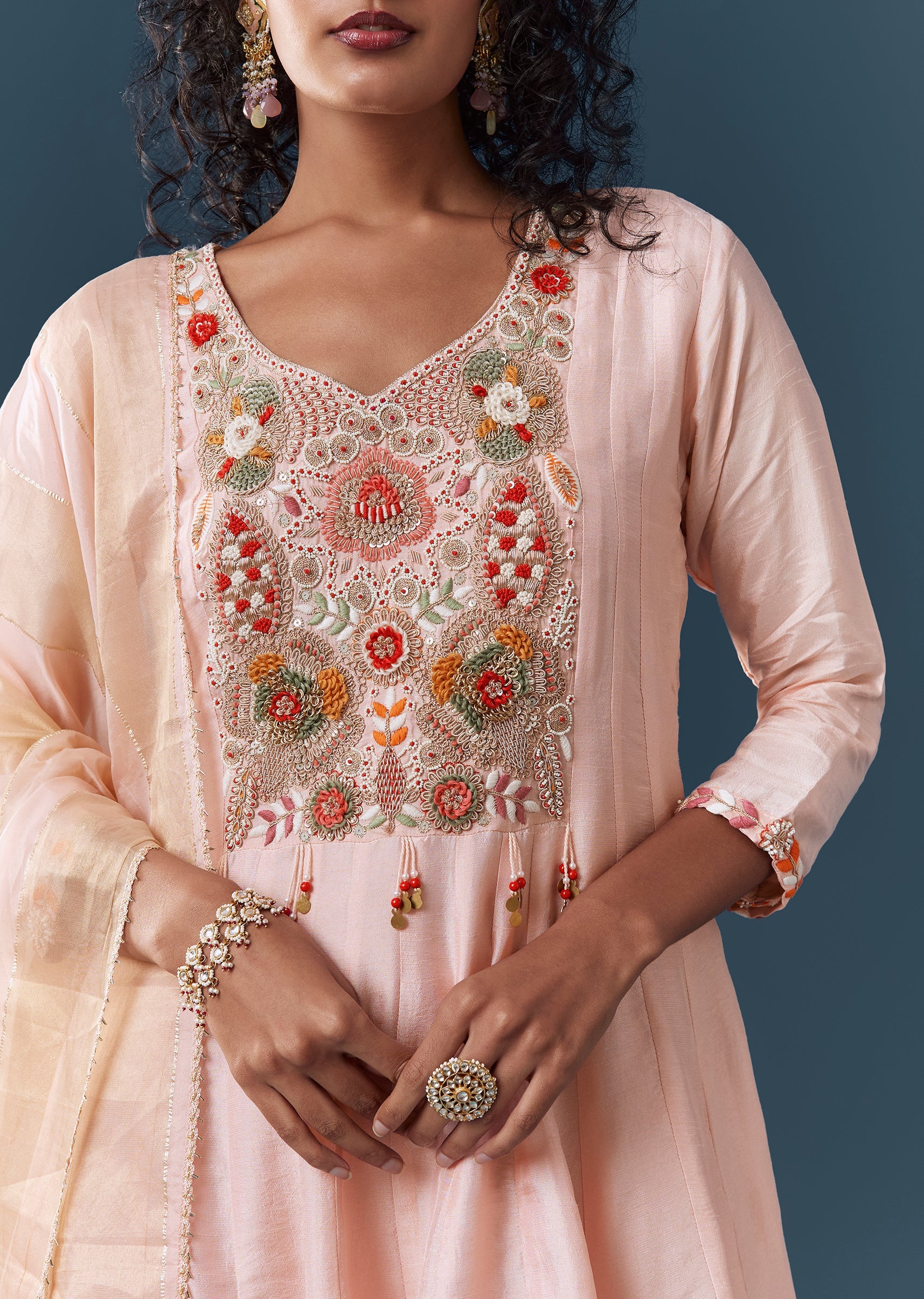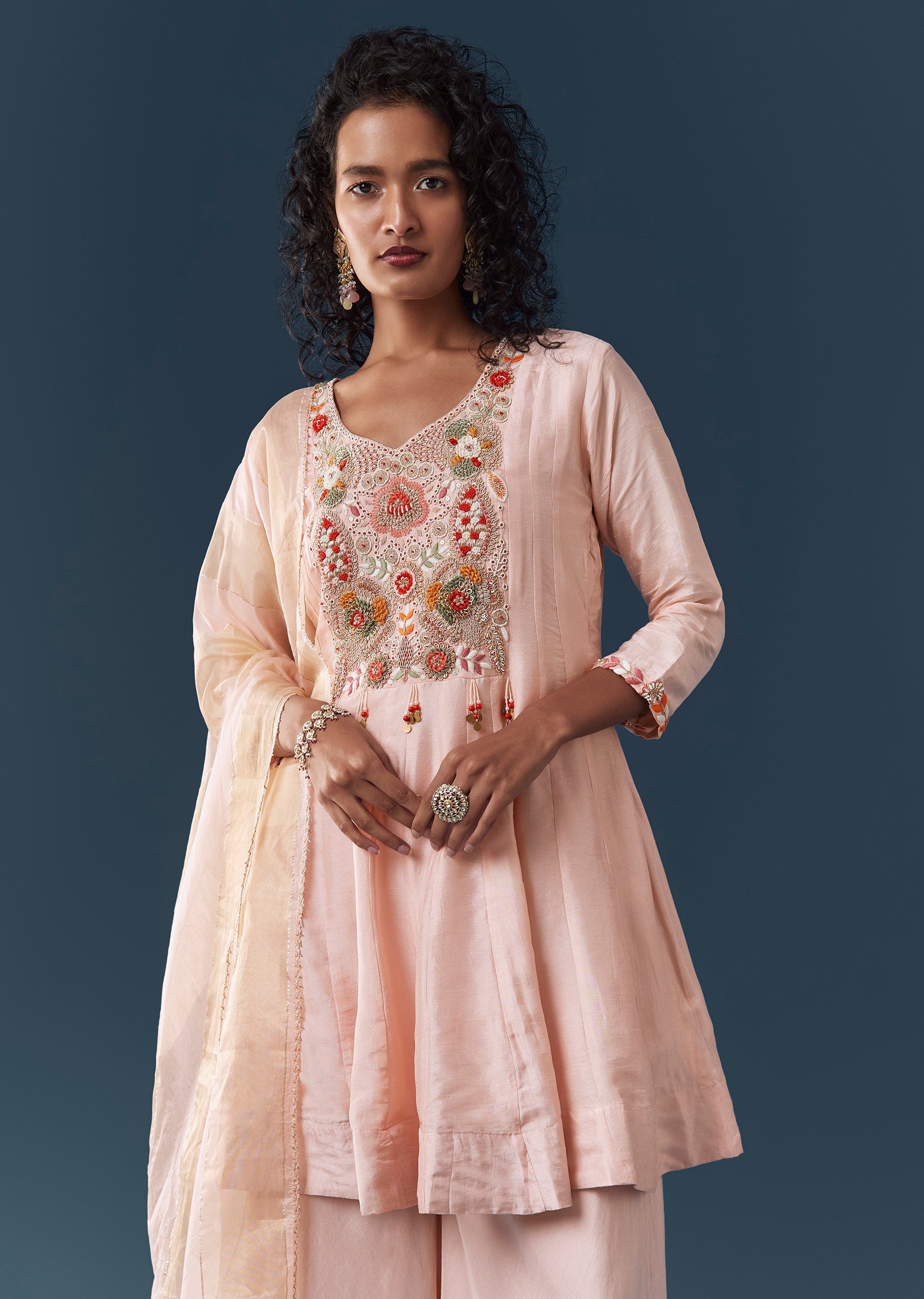 Designed in rich dola silk, this pastel palazzo set features an A-line kurta detailed with thread, zardosi and moti embroidery for an elevated festive appeal. The kurta comes with a... More Product Details