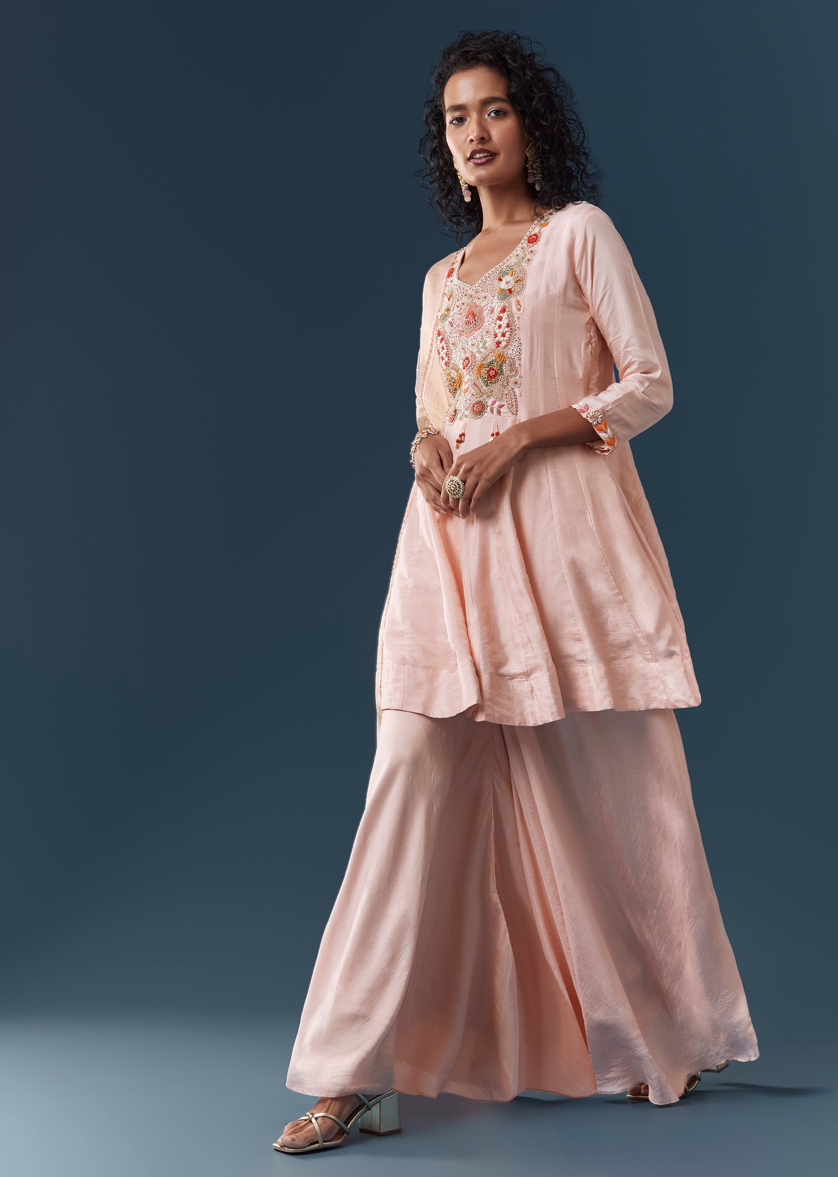 Designed in rich dola silk, this pastel palazzo set features an A-line kurta detailed with thread, zardosi and moti embroidery for an elevated festive appeal. The kurta comes with a... More Product Details