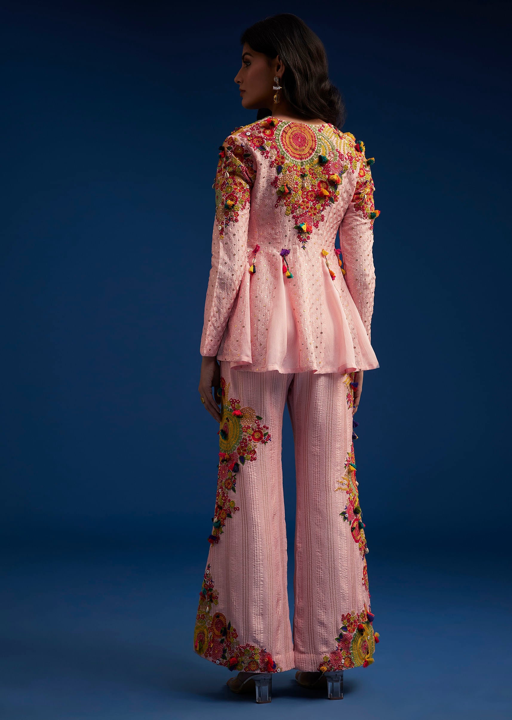 - Elevate your festive wardrobe with this baby pink palazzo set, featuring a slub silk inner and palazzo paired with a wrinkle georgette and silk jacket.