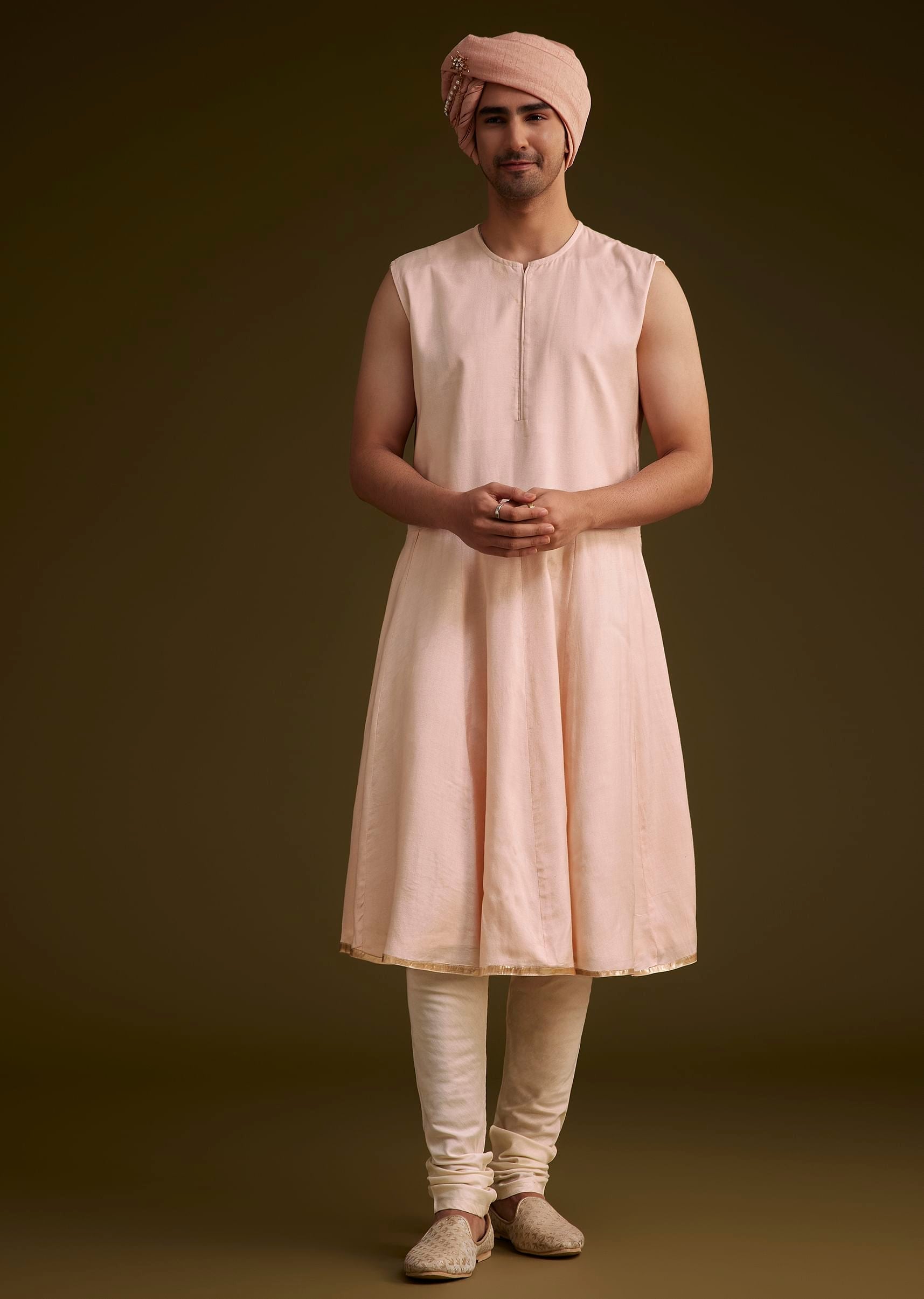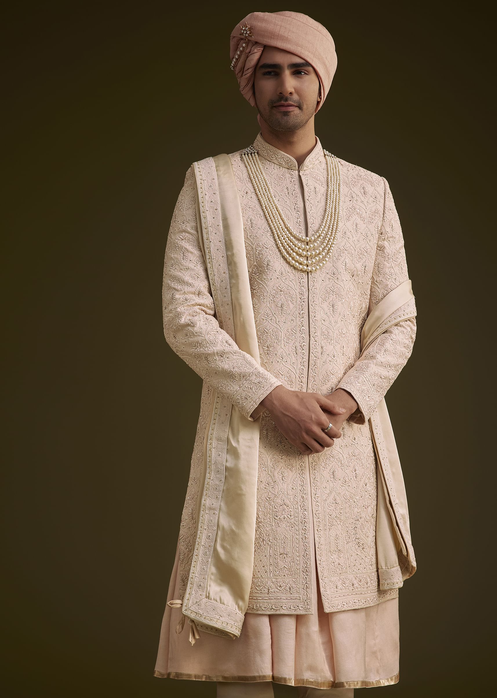 Baby Pink Silk Sherwani Set With Resham Embroidery