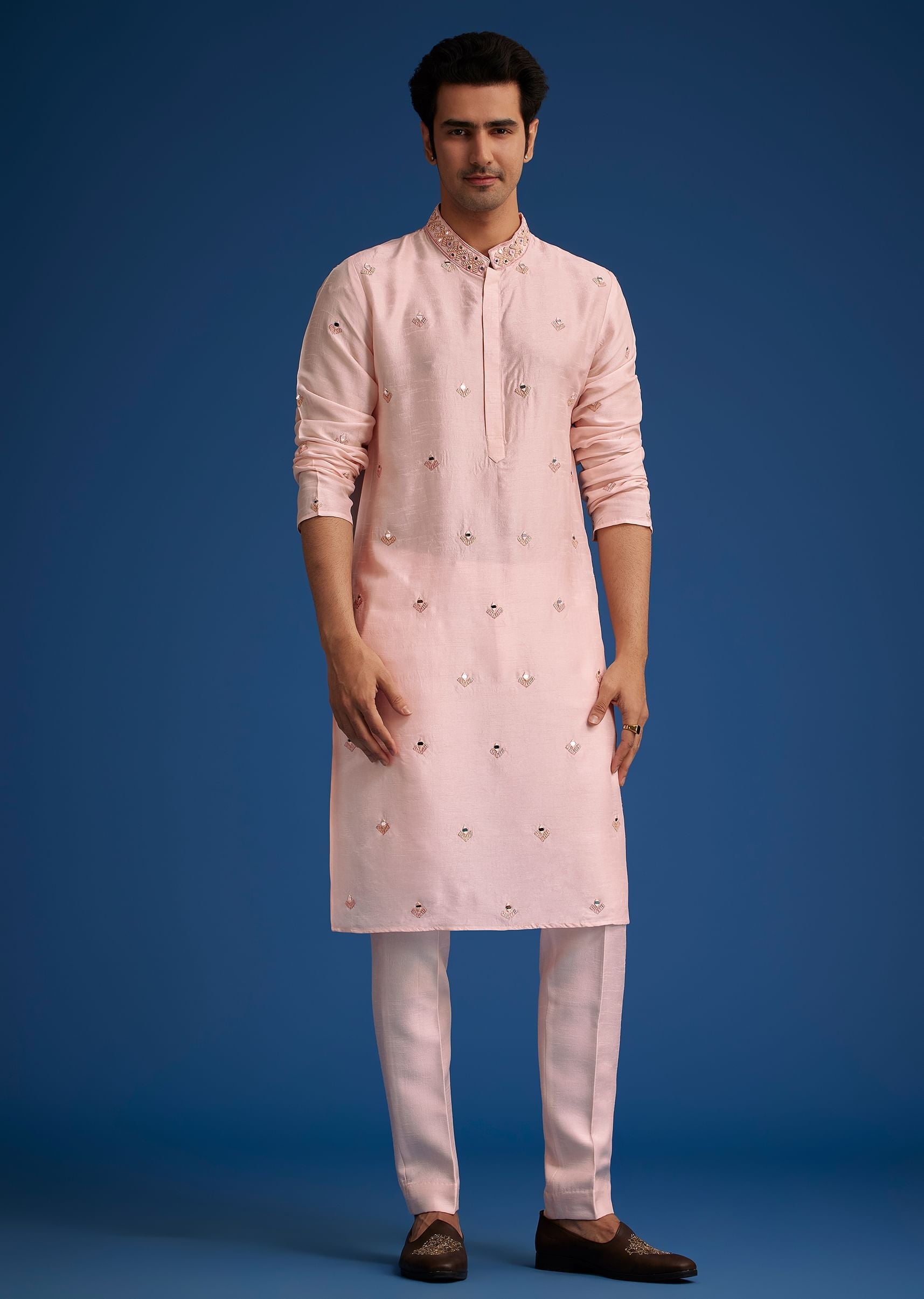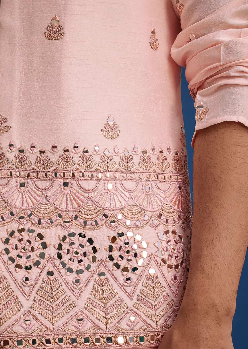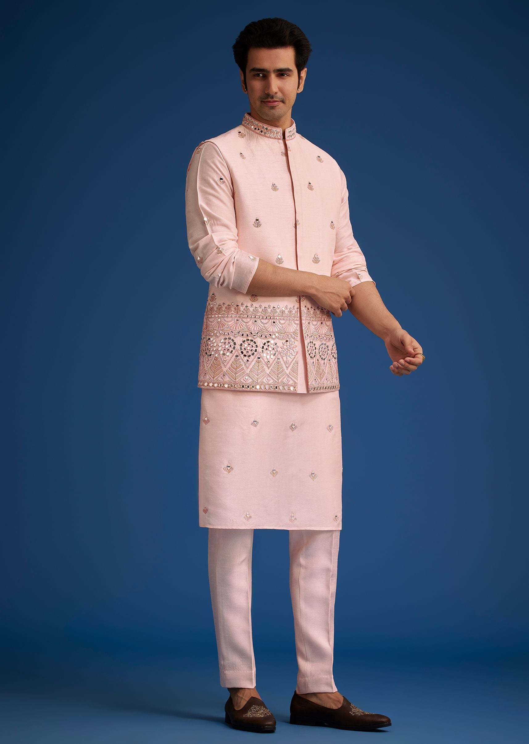 Baby Pink Tussar Kurta Jacket Set With Mirror Embroidery