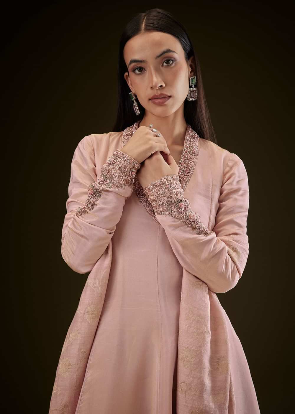 Embrace The Aura Of Timeless Elegance With This Baby Pink Vneck Anarkali Crafted To Make You Feel Like Royalty. The Flowing Silhouette Gracefully Dances With Every Step While The Intricately... More Product Details