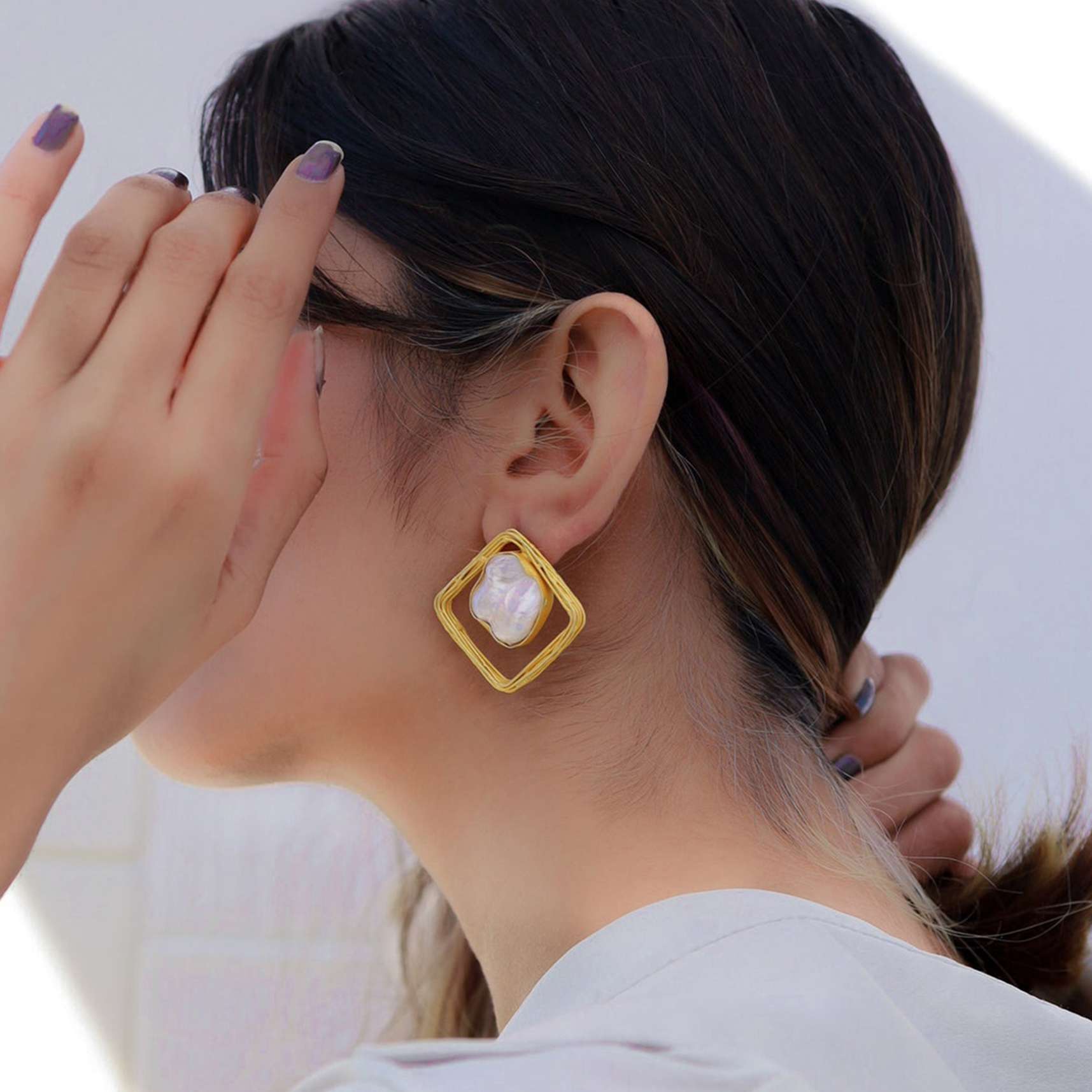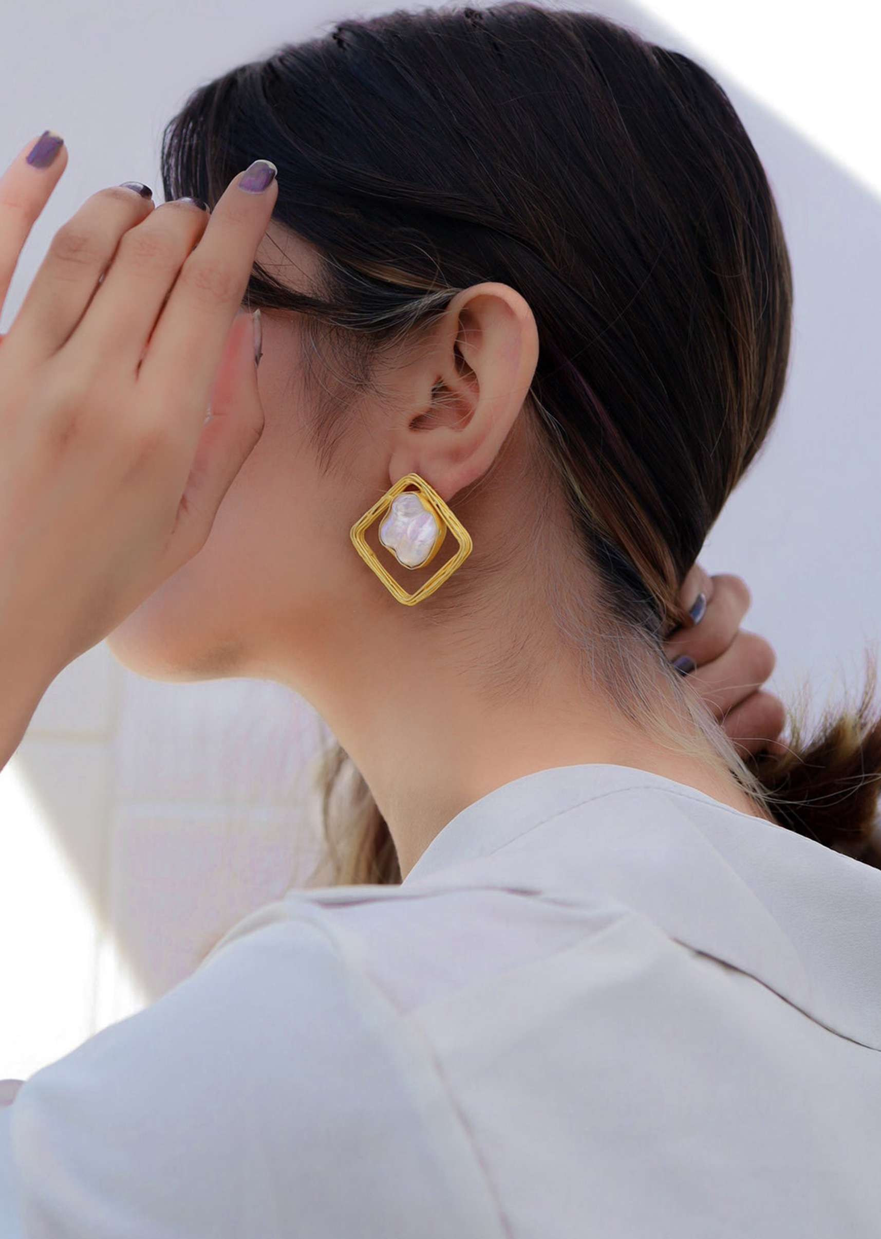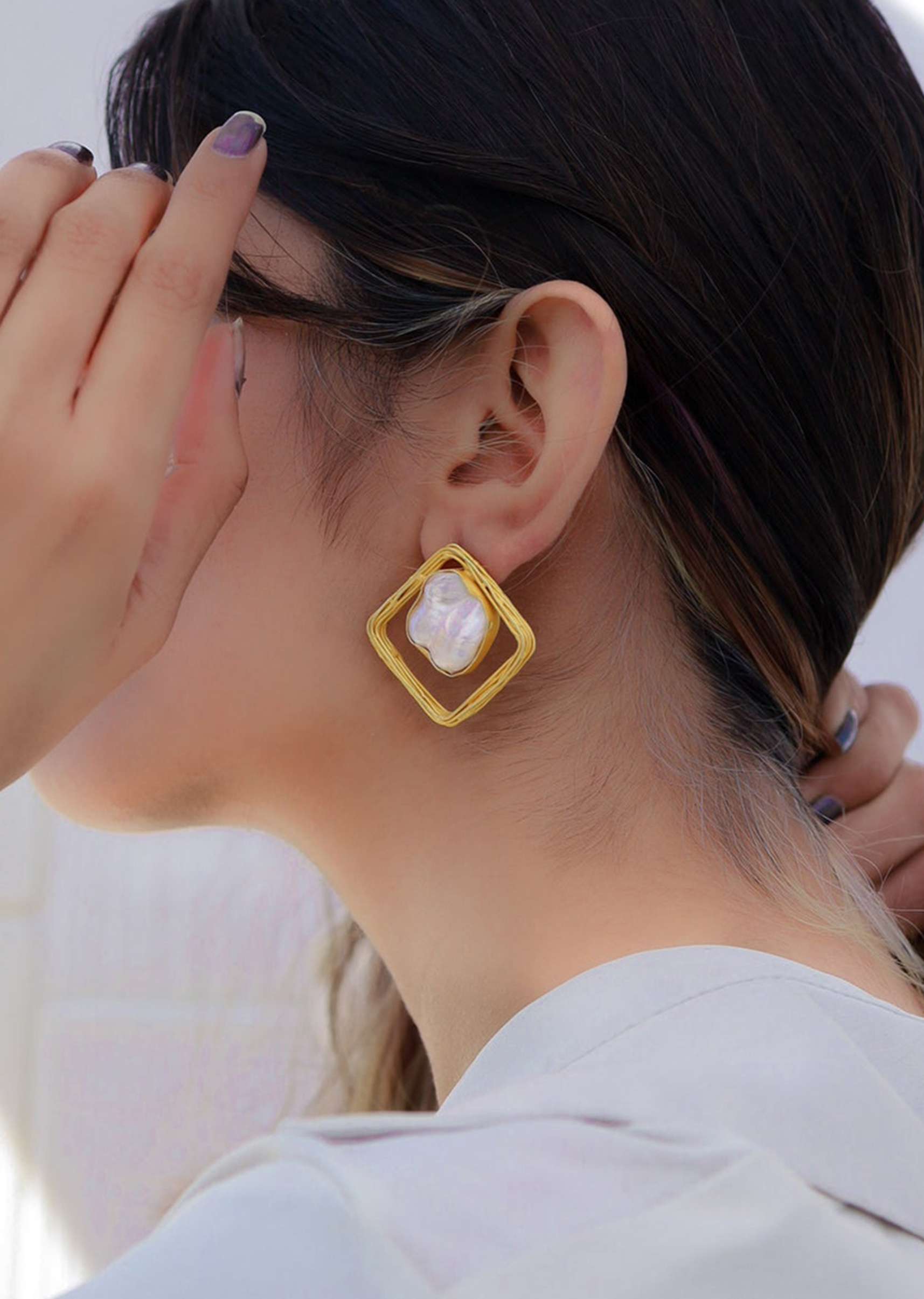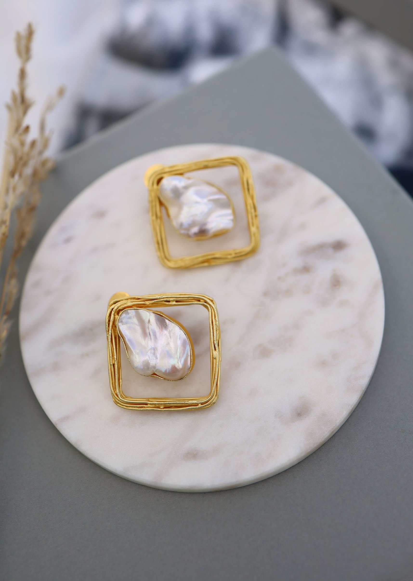 Gold square shaped with white moti stud earrings.It comes with a push closure.It is composed in semi-precious stone.PRODUCT CARE INSTRUCTIONS: Avoid contact with water, chemicals, harsh liquids, perfumes, etc.Do not wear this piece of jewelry while showering, gymming, swimming, etc.Hard contact must be avoided completely.Please keep the product away from moisture and humidity when not in use.Baroque pearls and Natural stones can range from minor aberrations to distinctly ovoid, curved, pinched, or lumpy shapes.P.S: "Baroque pearls are pearls with an irregular, non-spherical shape. Shapes can range from minor aberrations to distinctly ovoid, curved, pinched, or lumpy shapes.". Awarded as the Most Trusted Brand, we're delivering styles you love, just as promised.