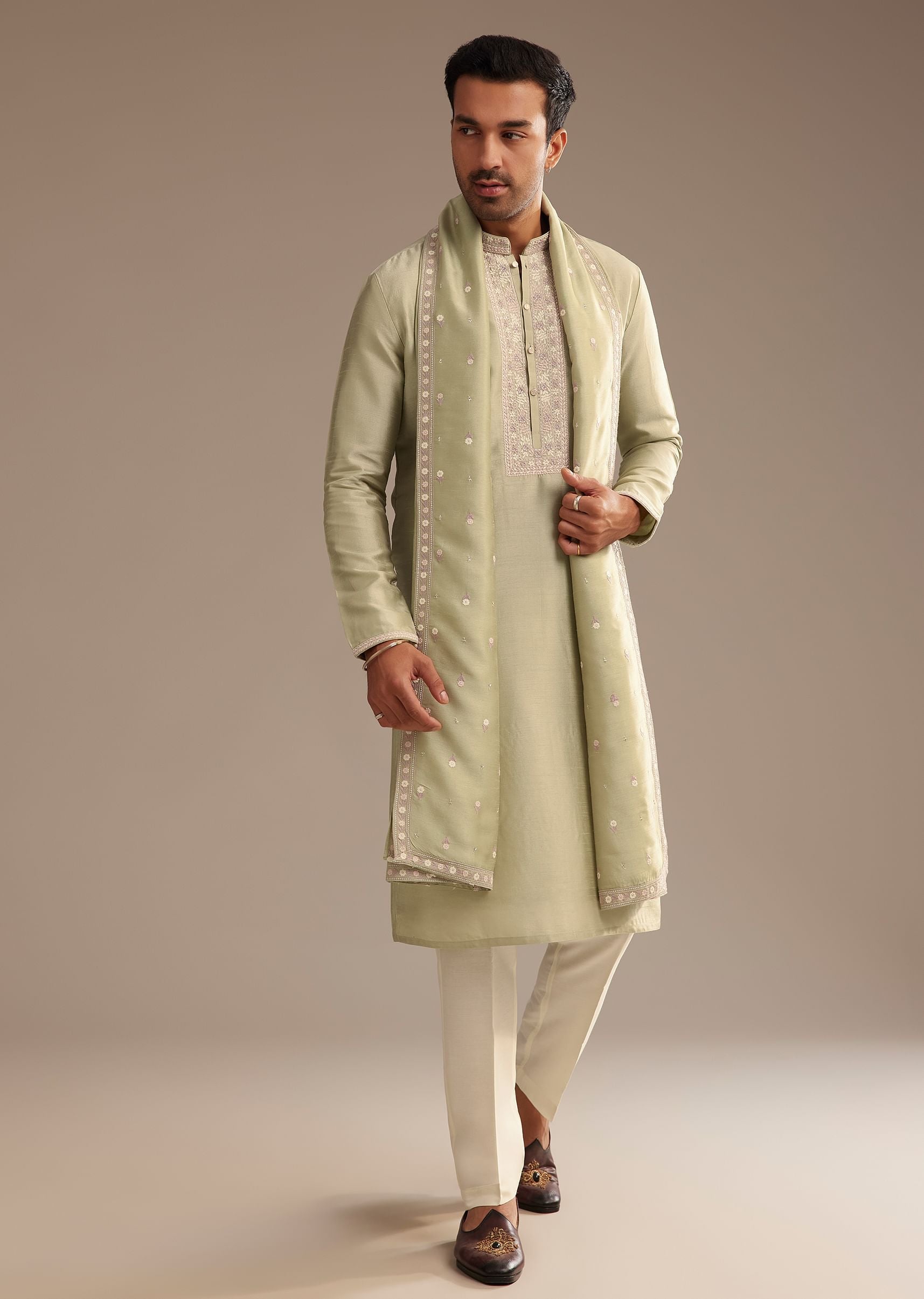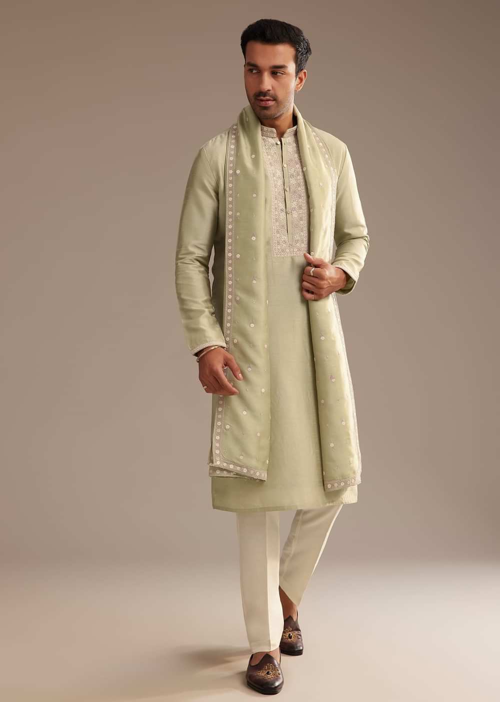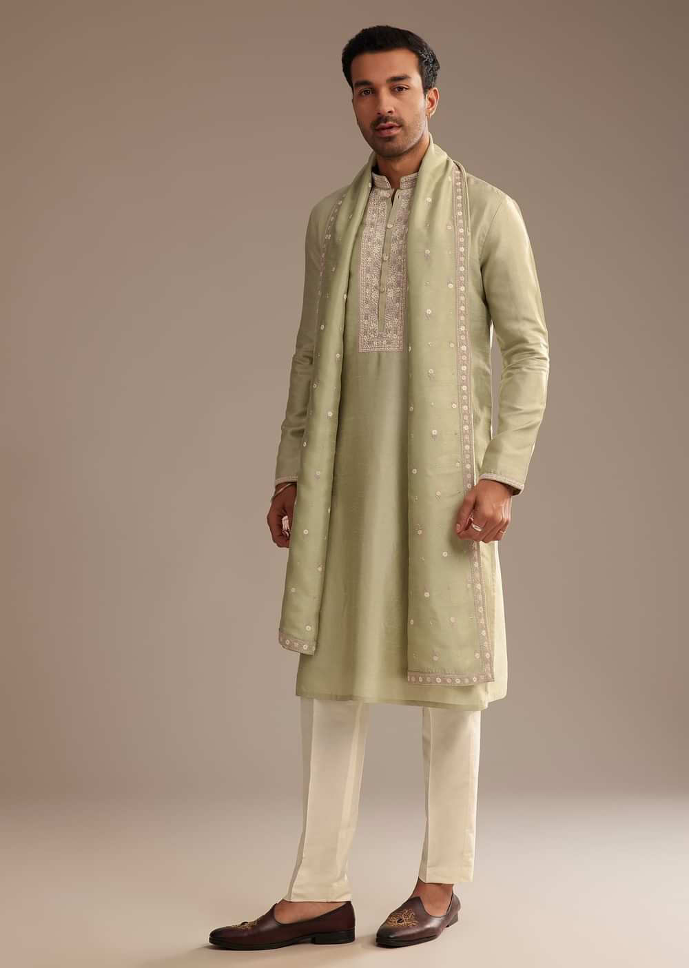 Embrace timeless elegance with this basil green kurta set, beautifully crafted from silk viscose. The subtle sheen of the fabric enhances the delicate embroidery on the neckline, creating an understated... More Product Details