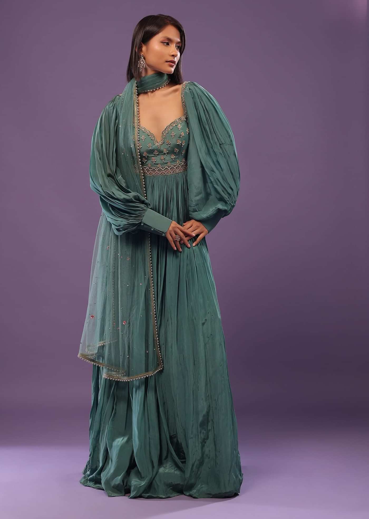 Bayou green festive anarkali suit embroidered in beads, sequins, and cut dana. The outfit is fabricated in crepe. The anarkali suit has a deep sweetheart neckline, back zip closure, a... More Product Details