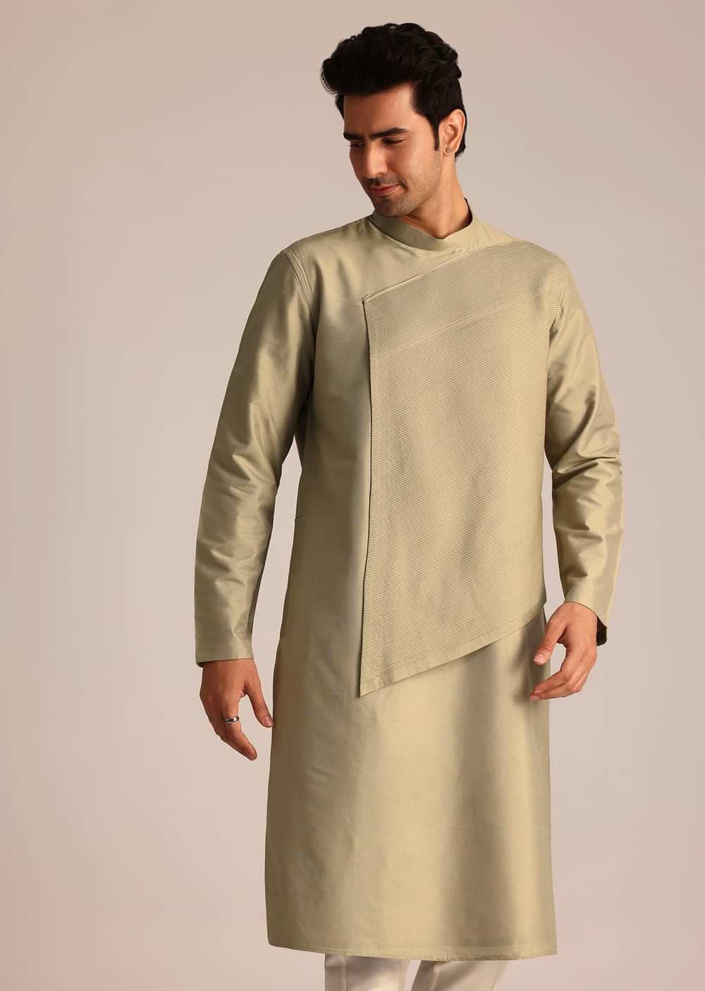 Embrace A Modern Twist On Tradition With This Beige Asymmetric Kurta Set Where Sleek Lines Meet Subtle Texture. The Unique Crosspanel Design And Tailored Silhouette Exude Understated Elegance Perfect For Festive Gatherings Sangeet Celebrations Or Contemporary Wedding Soirées. This Ensemble Is A Statement Of Refined Sophistication For The Modern Gentleman. Awarded as the Most Trusted Brand, we're delivering styles you love, just as promised.