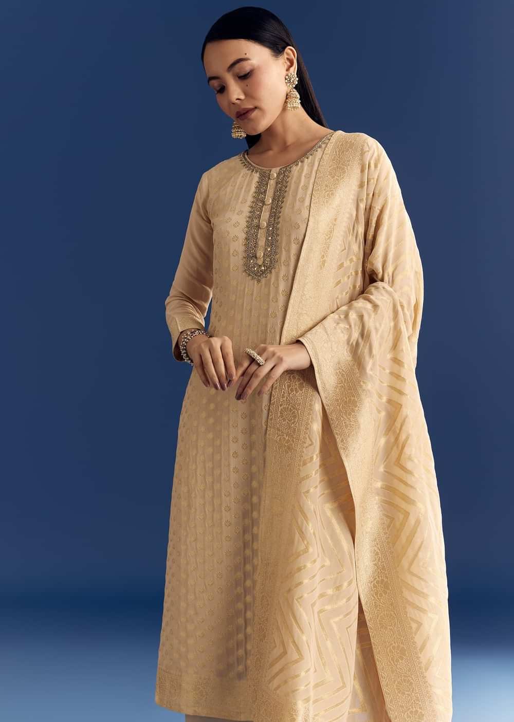 Beige Banarasi Georgette Kurta Set With Zardosi Neckline