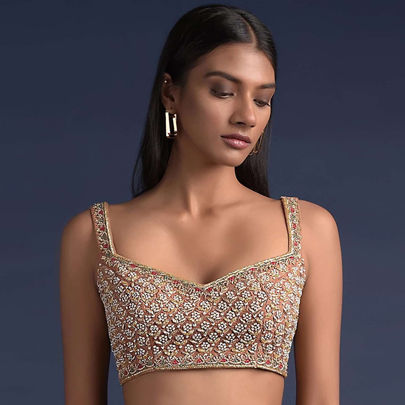 Beige blouse in raw silk heavily embroidered with zardosi, pearls, cut dana and thread work in floral buttis.Designed sleeveless with sweetheart neckline.Waist highlighted with a matching embellished belt.The length of the blouse is 12 inches. Awarded As The Most Trusted Brand We'Re Delivering Styles You Love Just As Promised.