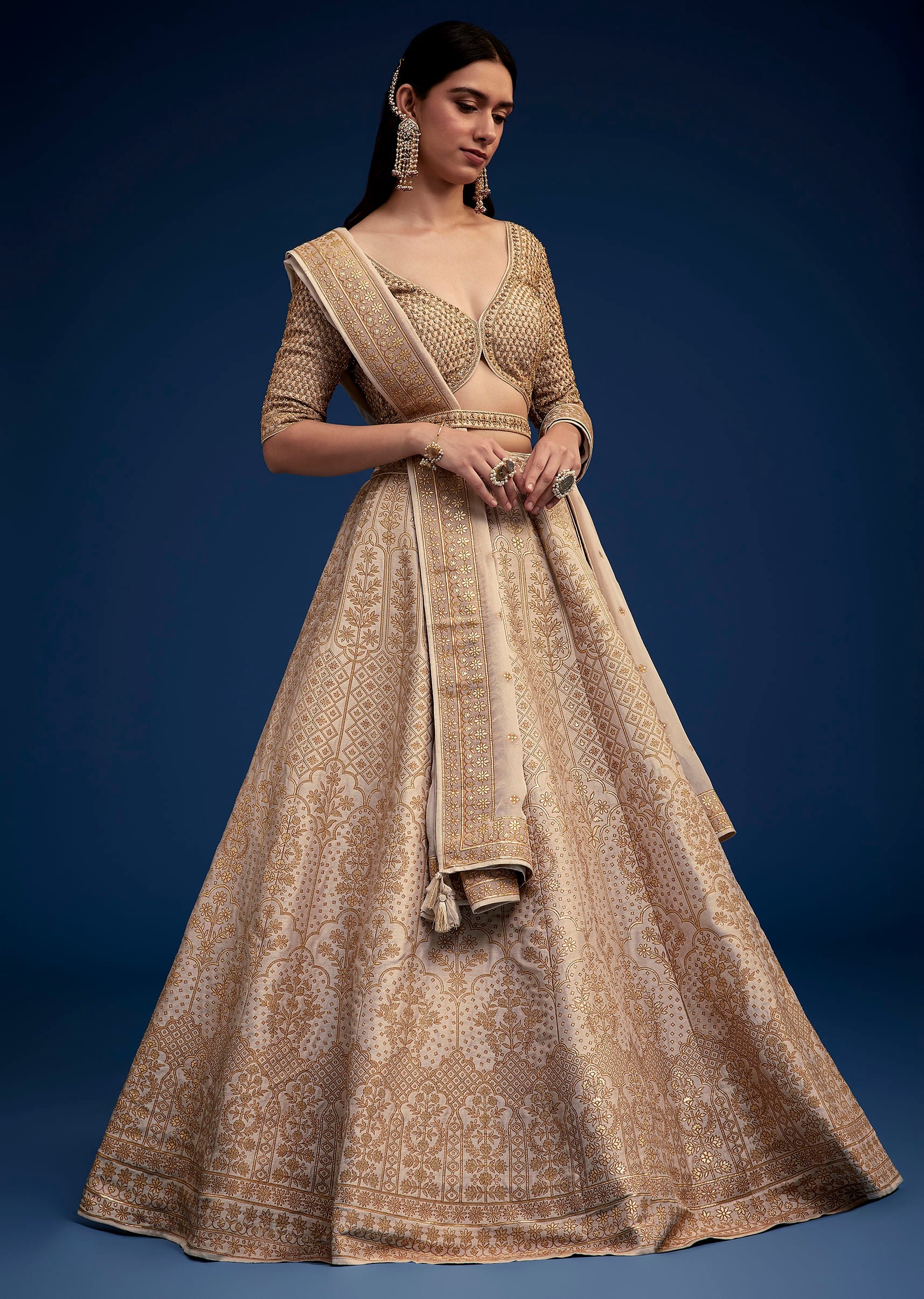 Make A Royal Statement In This Beige Lehenga Choli Set Crafted In Exquisite Brocade Fabric With Intricate Patterns And A Structured Belt For A Modern Touch. The Rich Texture And... More Product Details
