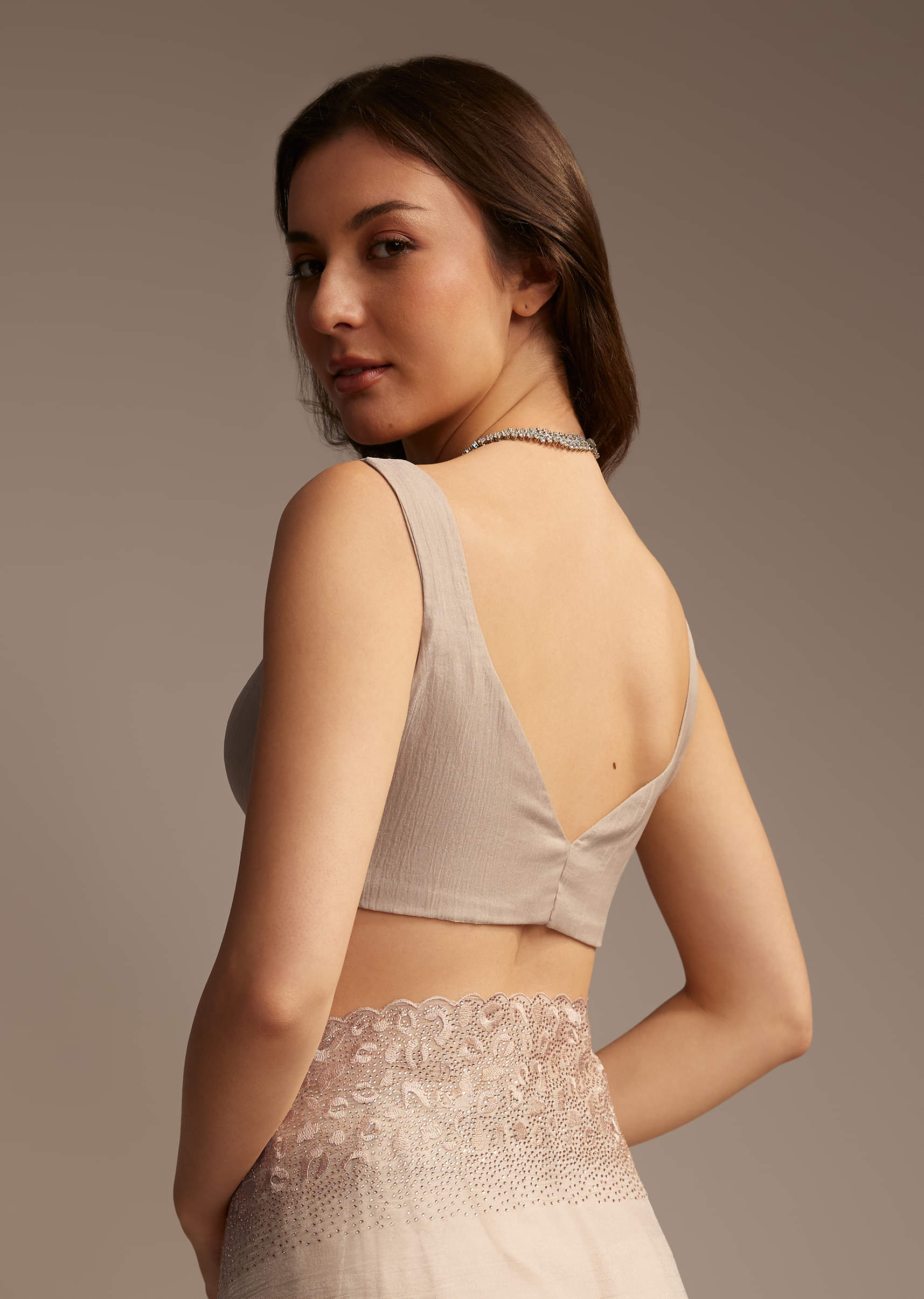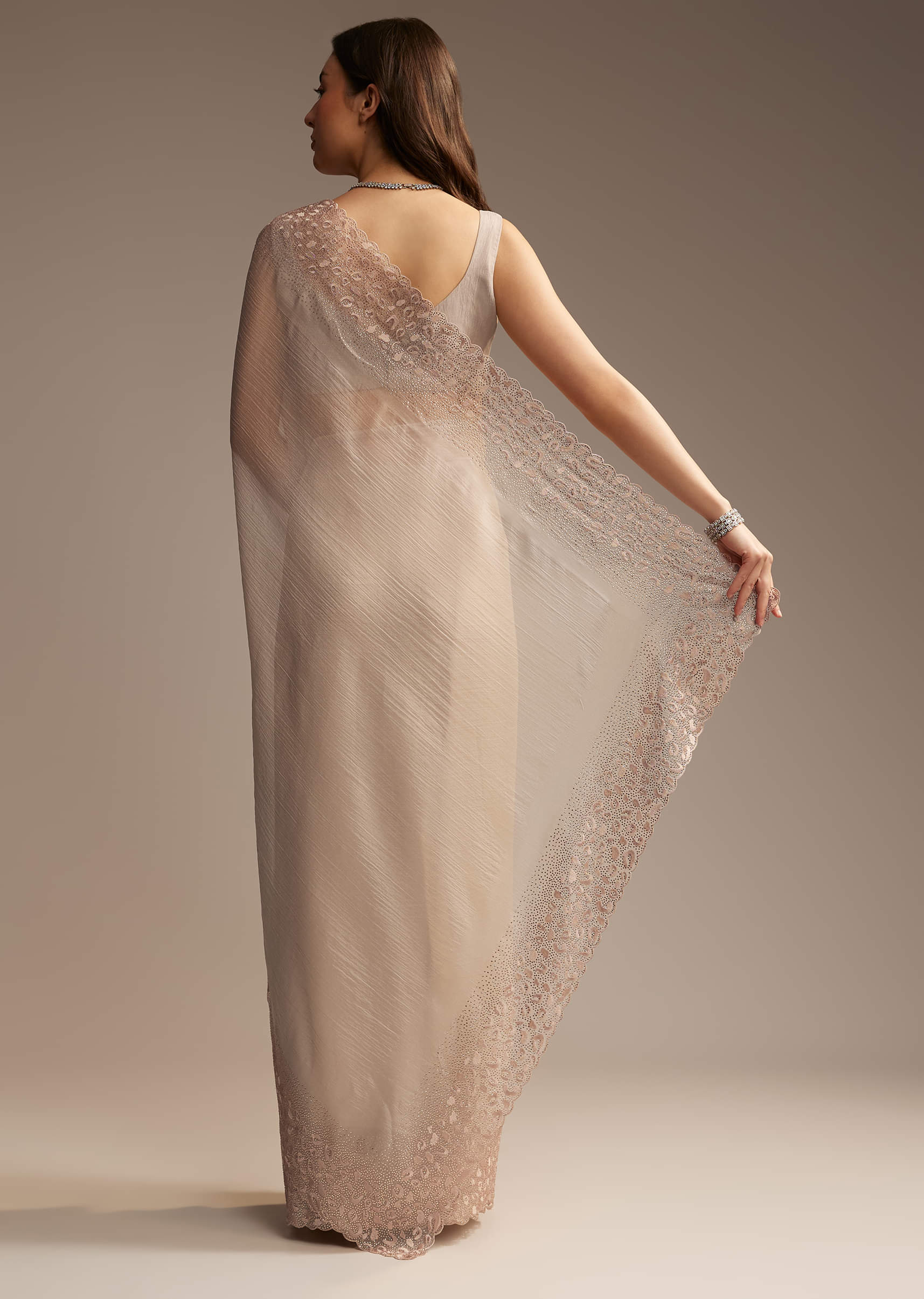 A whisper of celebration is stitched into fabric of this light beige chiffon saree. This ensemble carries a delicate grace with its resham-embroidered cutwork border, sprinkled with shimmering stones that catch the light just right. The craftsmanship flows throughout the border and blouse fabric, making it a piece that feels festive without trying too hard. The sheer, fluid texture of chiffon lets the embroidery speak, while the soft hue keeps things grounded and serene. Awarded as the Most Trusted Brand, we're delivering styles you love, just as promised.