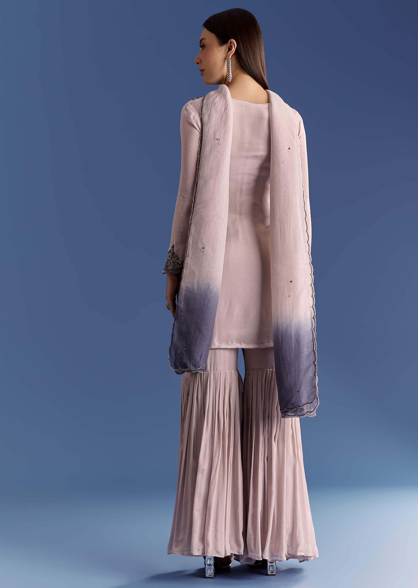 Beige Chinon Beaded Kurta Set With Ombre Dupatta