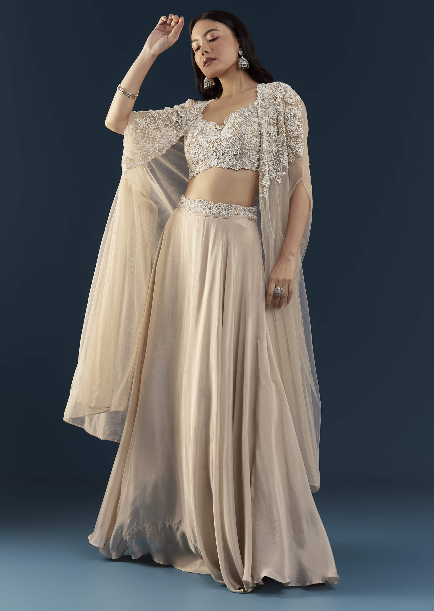 Beige Chinon Silk Crop Top Palazzo Set with Cape