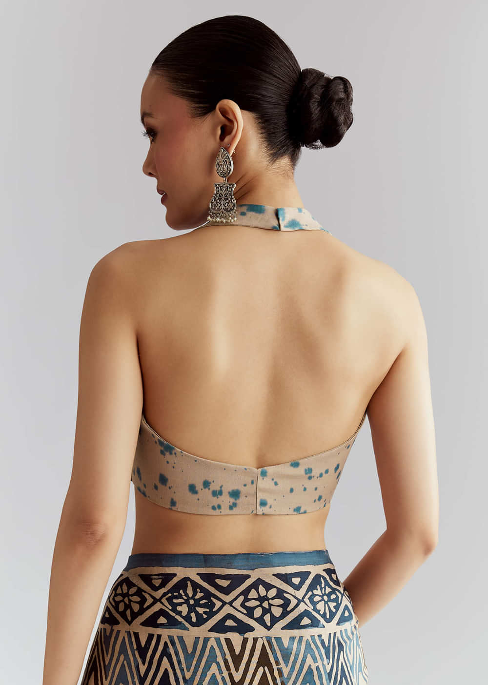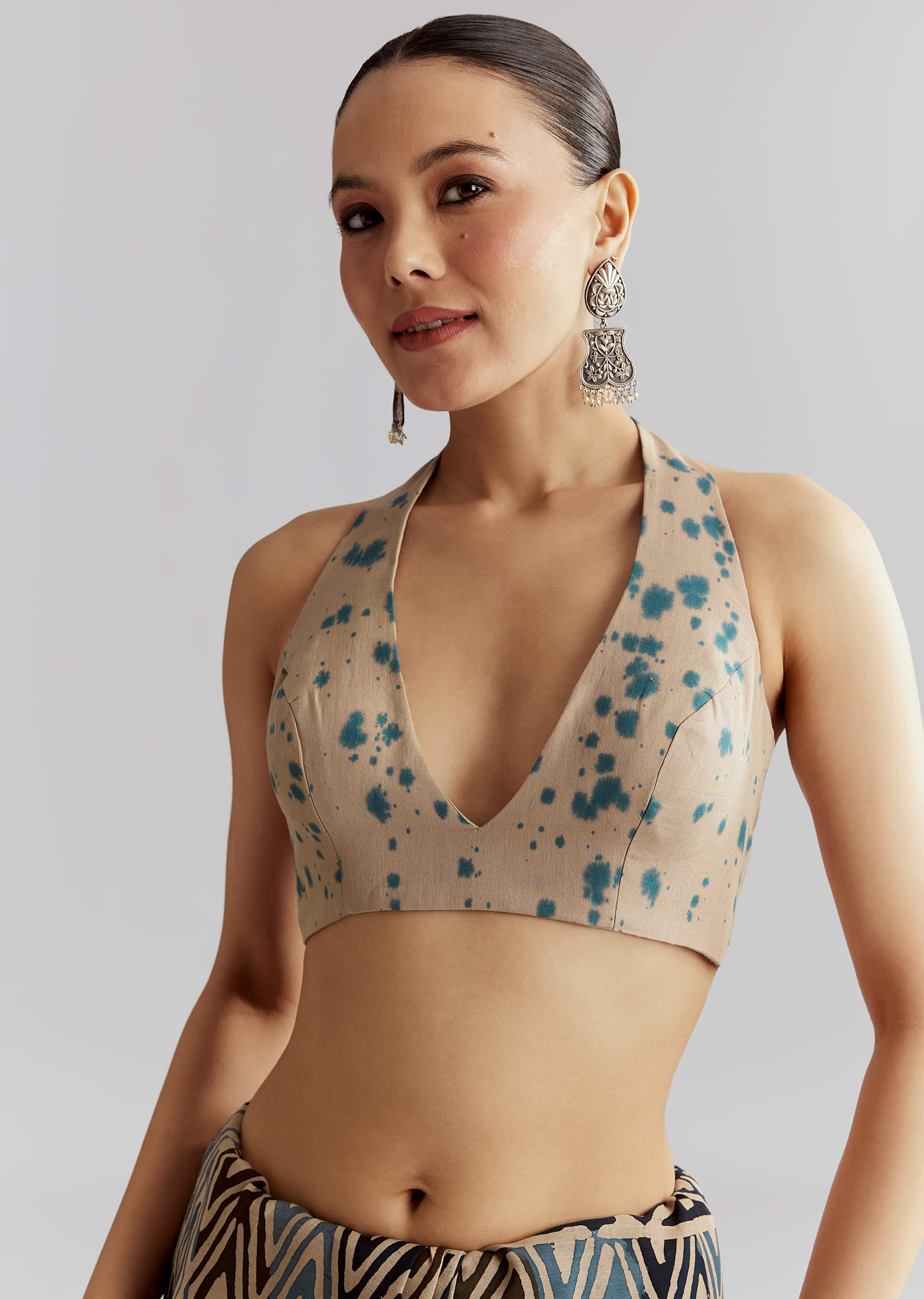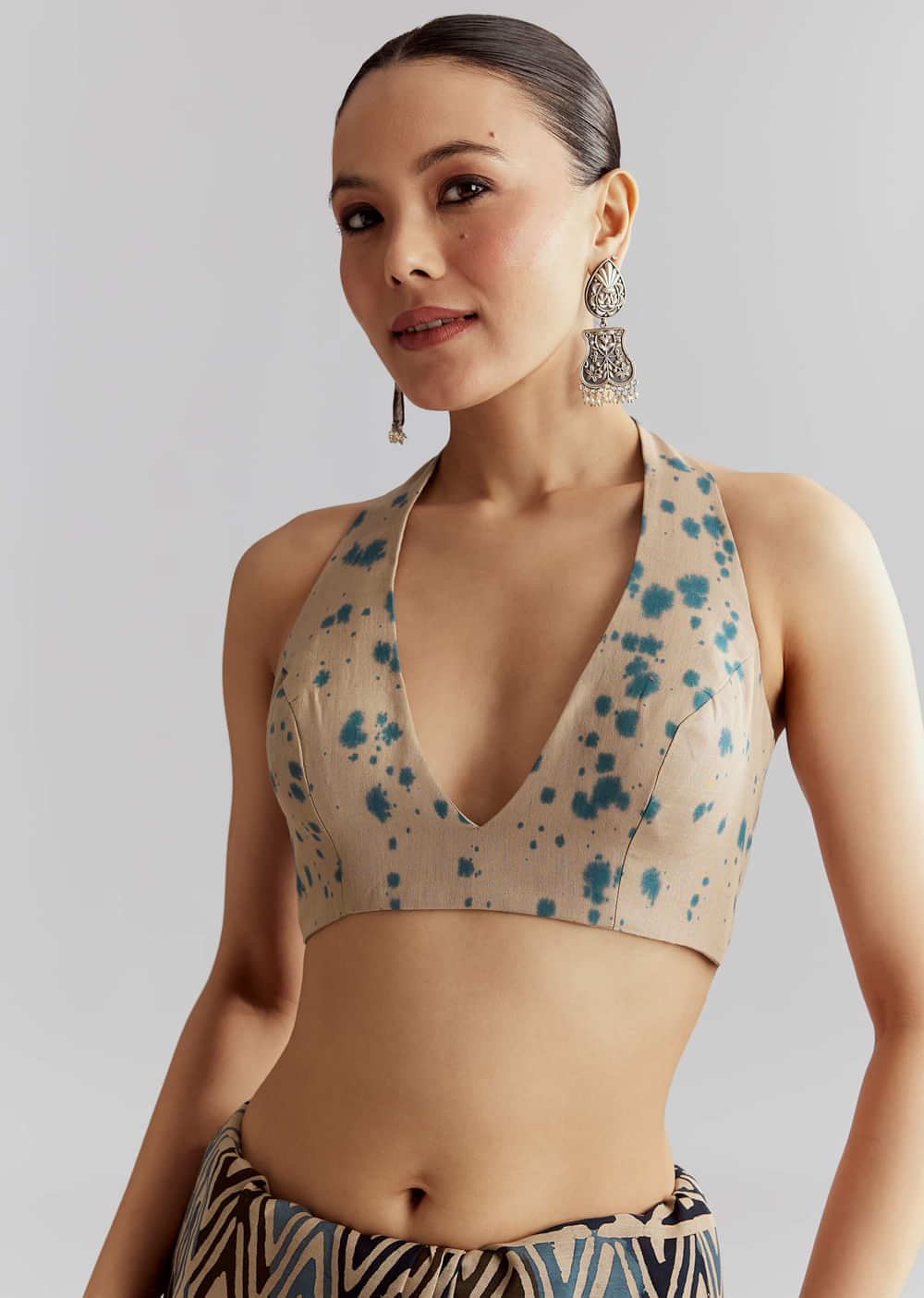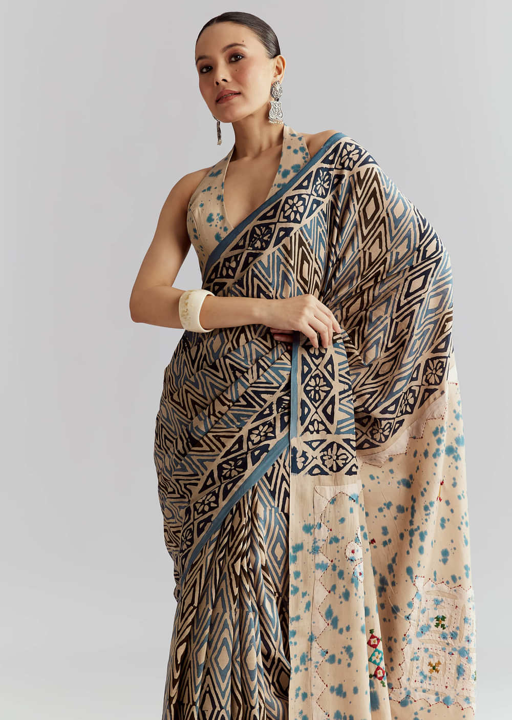For days that call for ease and craft, this beige cotton linen saree sets a hand block–printed geometric pattern in black and blue over a breathable base. A hand-painted pallu... More Product Details