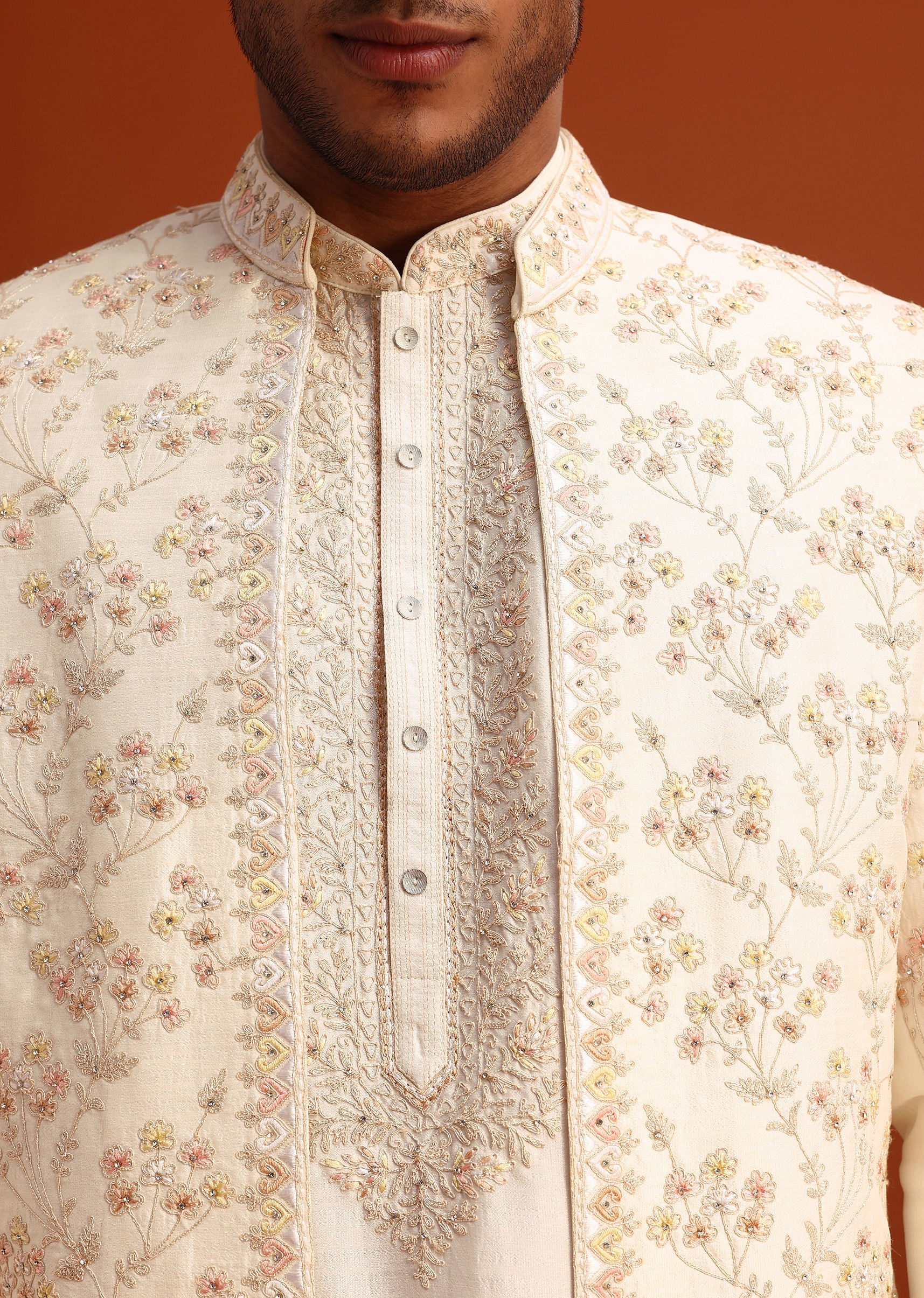 Classy and contemporary, this opulent beige sherwani set will charm the crowd at every occasion. Fabric from premium cotton silk, the sherwani is thoughtfully crafted with a mandarin collar and comfortable full sleeves. Adorned with intricate resham work and hand embroidered motifs, this stunning fit is perfect for grandeur celebrations. Awarded as the Most Trusted Brand, we're delivering styles you love, just as promised.