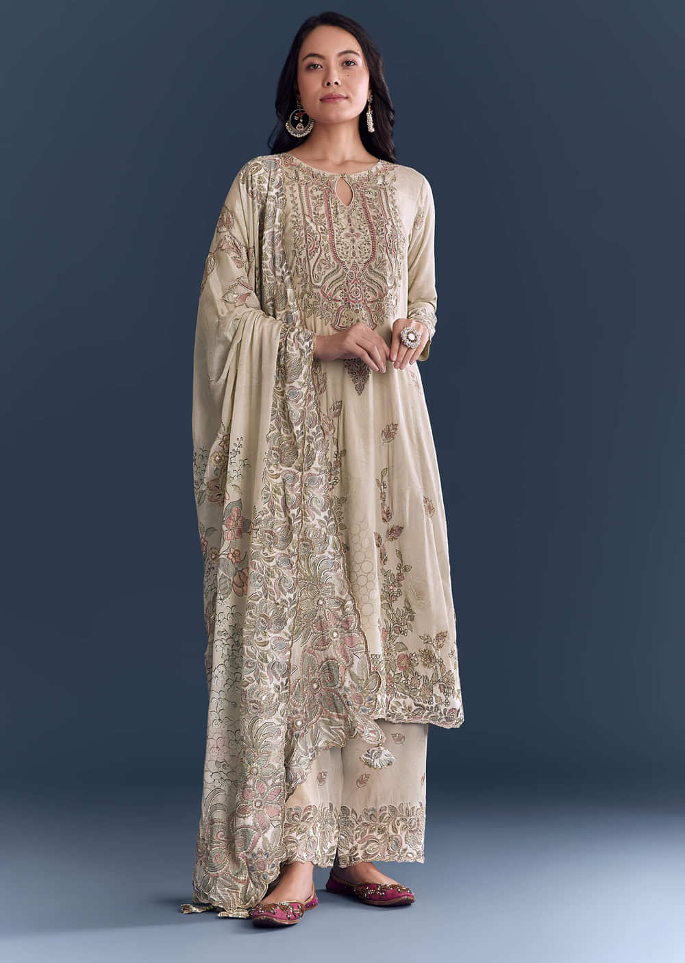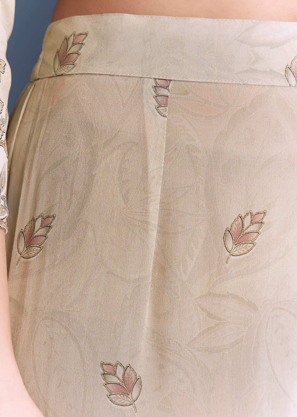 Beige Crepe Kurta Set With Floral Print And Zari Work