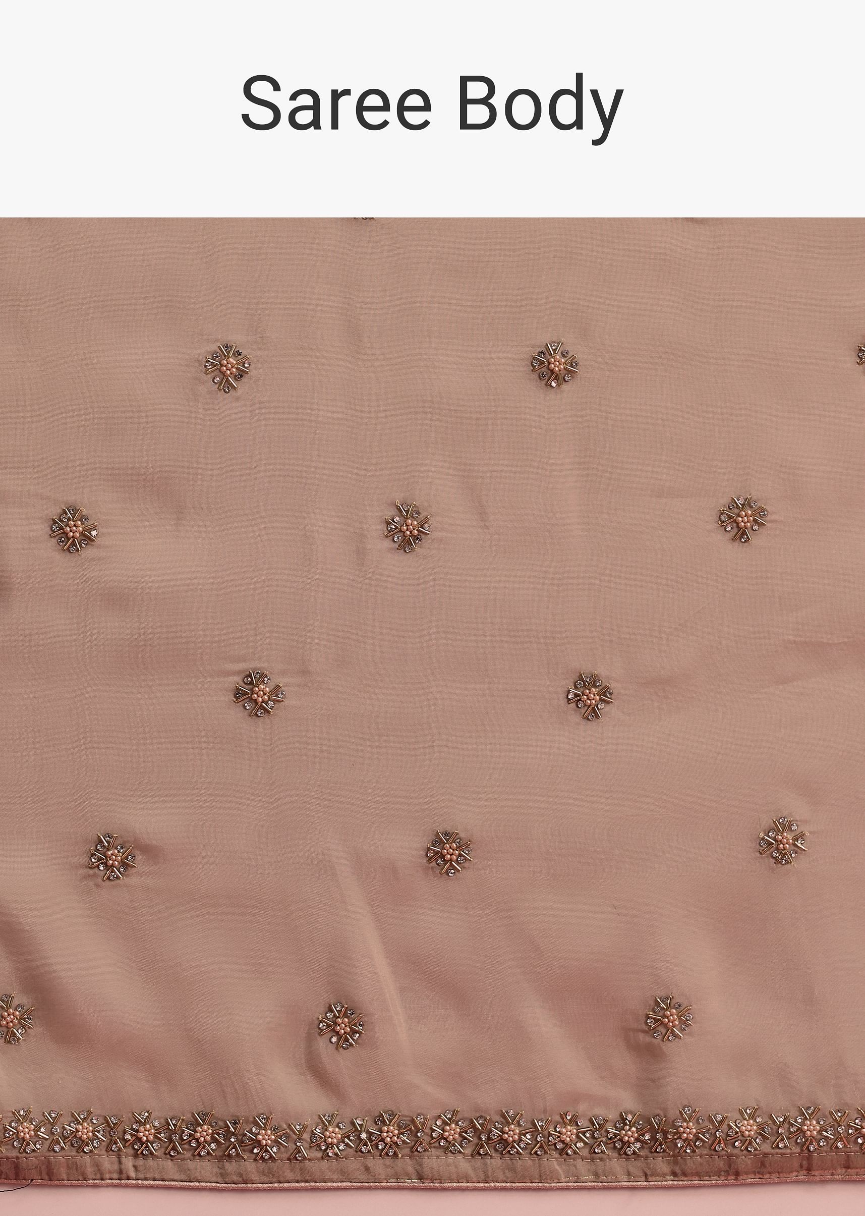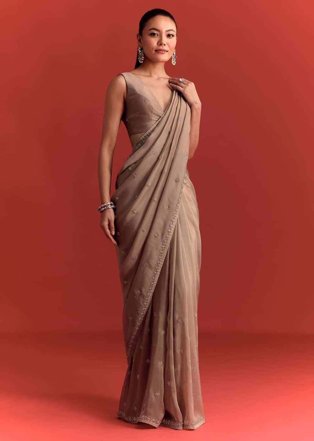 Our earthy beige crepe silk saree features luminous intricate embroidery, that will spark joy in your ethnic wardrobe. Adorned with accents of cutdana, stone and beads, this stunning piece is ideal for special occasions, cocktail parties and festive events. Awarded as the Most Trusted Brand, we're delivering styles you love, just as promised.