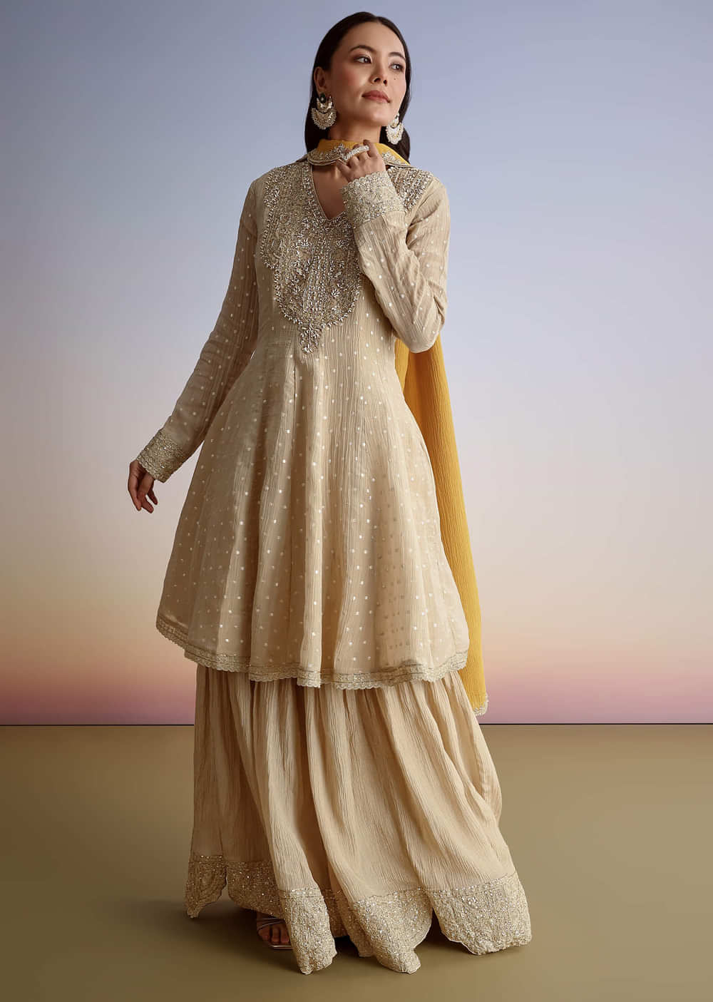 Beige Crush Tissue Embroidered Kurta Sharara Suit With Dupatta