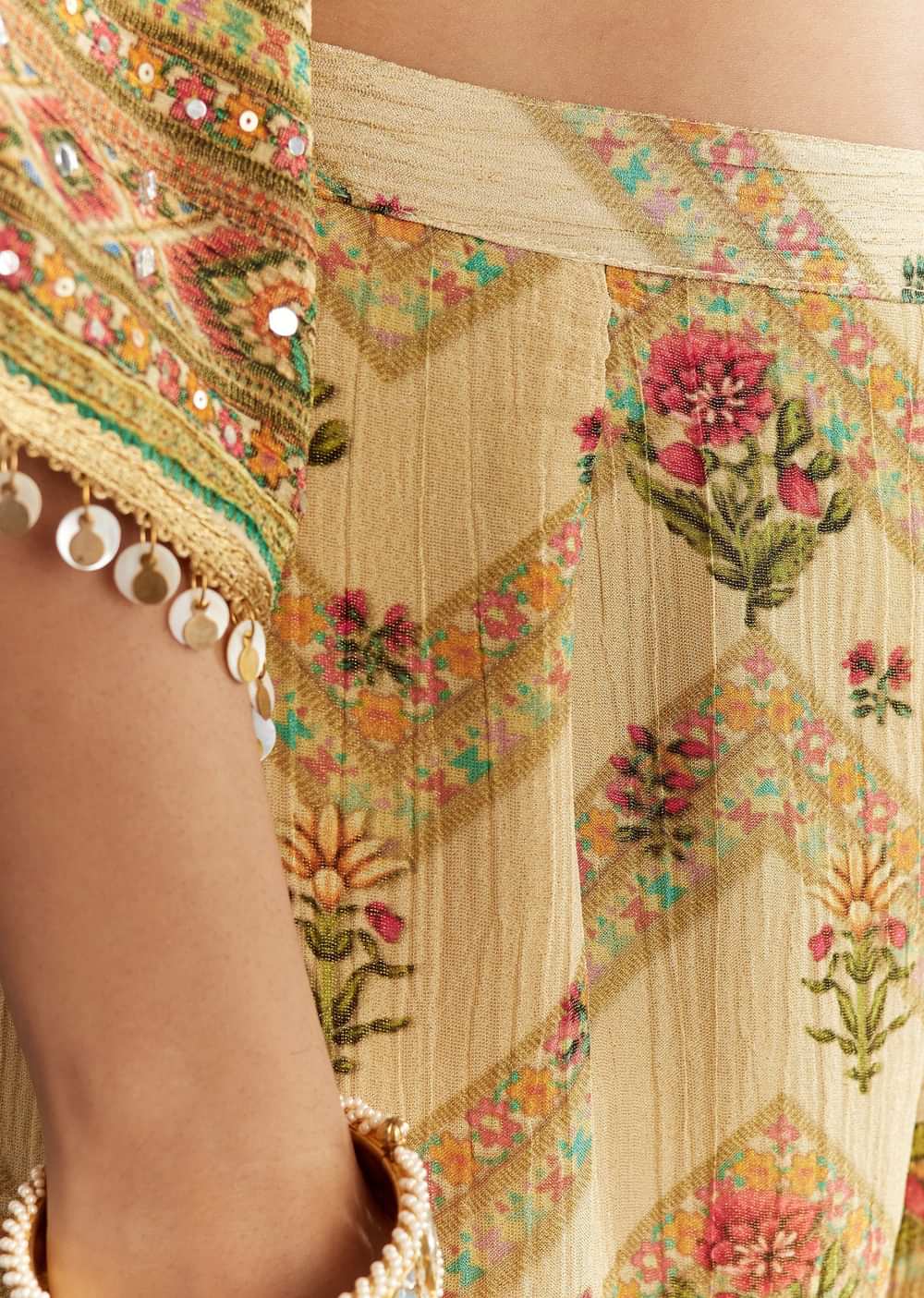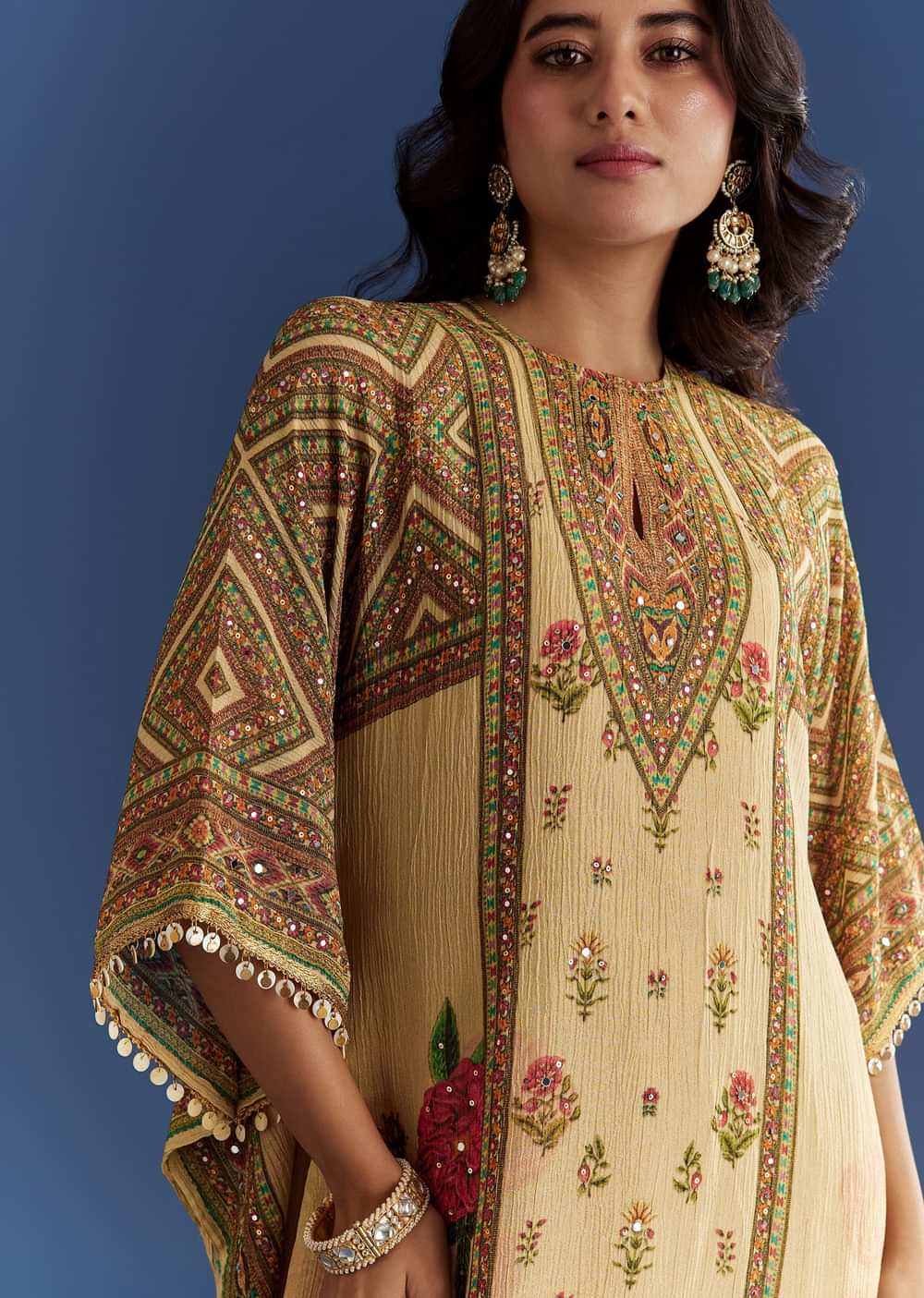 Beige Crush Tissue Floral Printed Kaftaan Sharara With Mirror Sequins Work