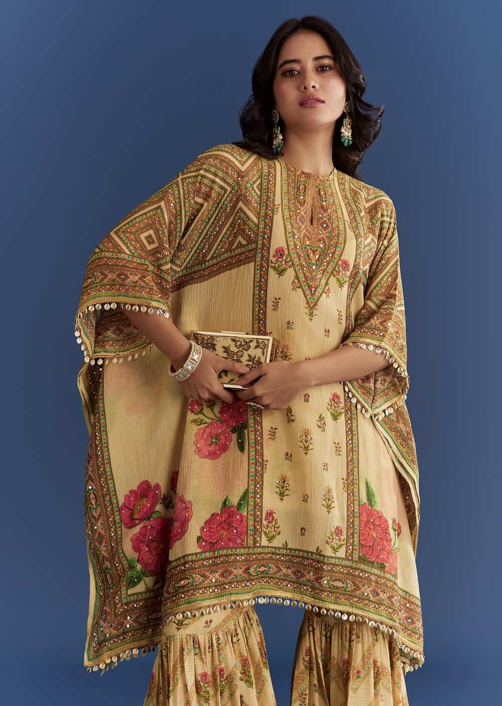 Light and ethereal, this beige kaftaan kurta stuns with mirror and sequins work, floral printed sharara, and festive elegance in every layer.